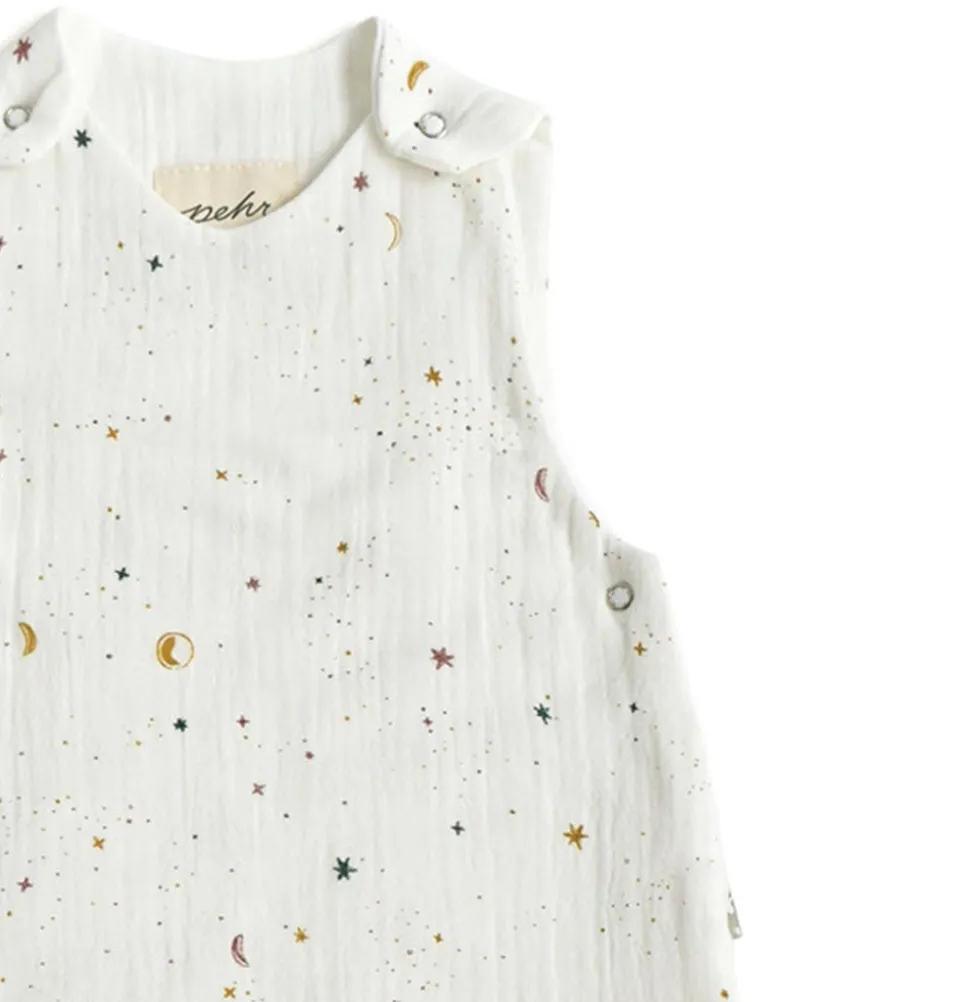 Pehr creates beautiful must-haves that are made to mix and match. Designed in Canada, the brand offers organic clothing, accessories, and storage baskets for room decor. Everything you need for newborns, toddlers, and kids. Made from organic muslin cotton, the 1.0 TOG Sleep Bag in Celestial is the ideal weight for a peaceful night’s sleep. The Sleep Bag Thermal Overall Grade 1 TOG is for room temperatures of 75 – 81 °F , 24 – 27 °C. With 2 layers of muslin, it’s both breathable and incredibly soft. It also unzips side to bottom with a zipper for easy diaper changes. Designed for little one’s comfort and your piece of mind, there is an added under-arm snaps in our 0-9 month size to ensure a perfect fit for your growing baby.