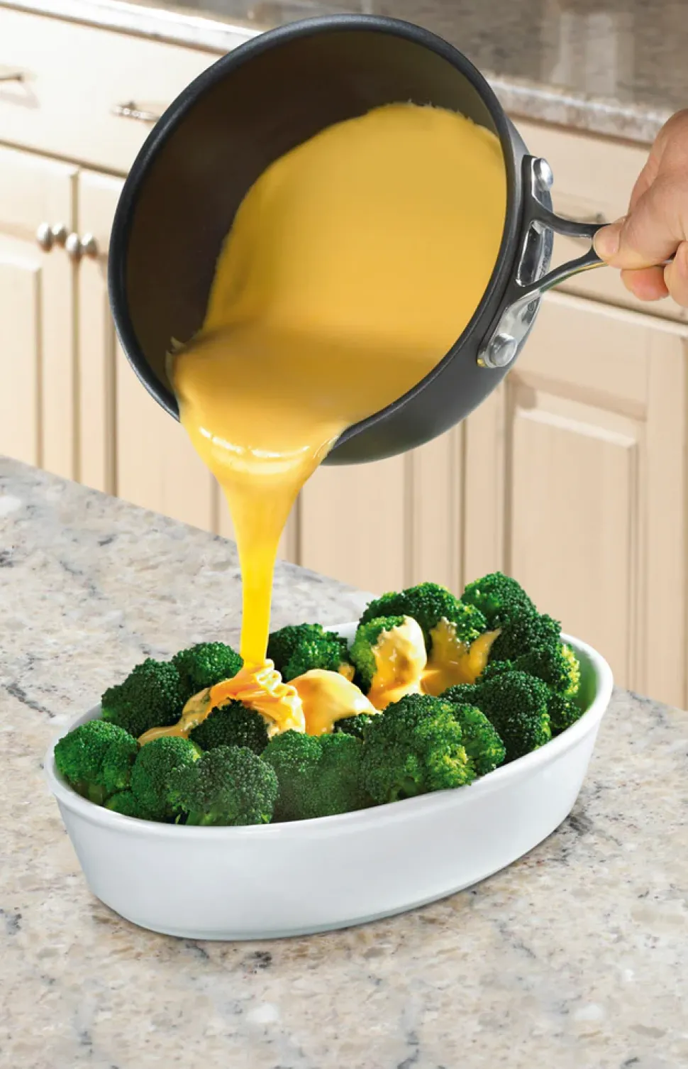 Hard anodized aluminum construction ensures fast and even heat distribution. PFAS-free PURELYCERAMIC® nonstick interior delivers smooth food release and easy cleanup. Cool Grip® stainless steel handle stays cool on the stovetop. V-flange design redirects heat into the pan while keeping the handle comfortable to hold. Features interior measurement markings and drip-free pouring design. Oven safe up to 500°F.