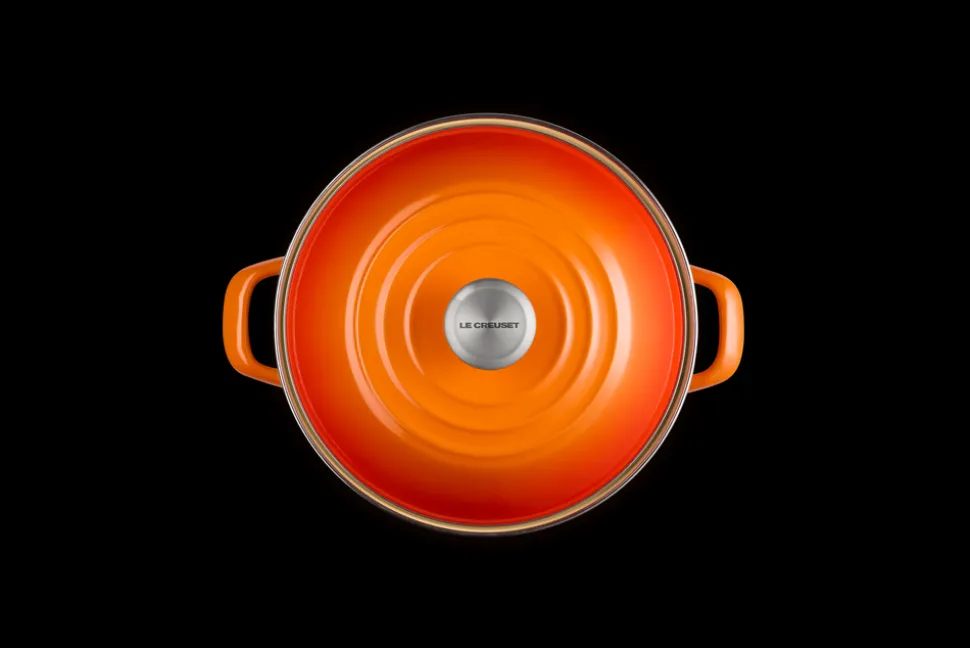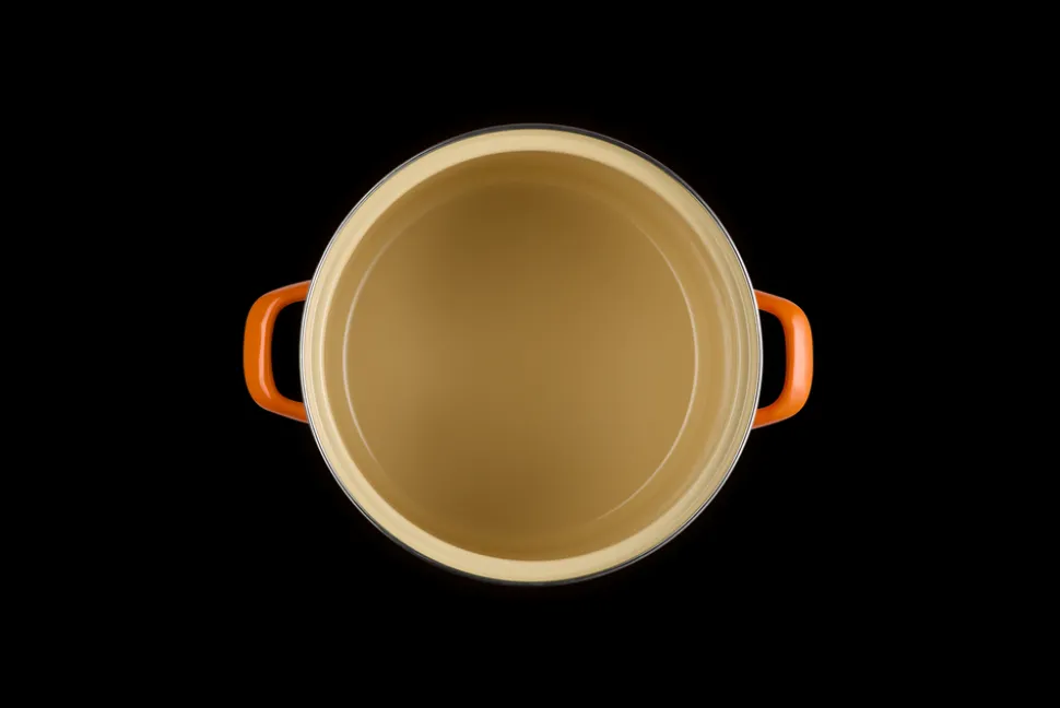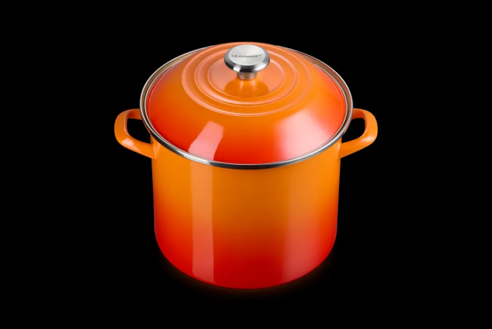 Recognized for its strength and durability, as well as its beauty and quality, Le Creuset produced the first enameled cast iron cookware nearly a century ago. A tradition of maintaining the finest culinary craftsmanship, combined with the latest innovations, means Le Creuset is known for blending classic form with real function and that it’s made for home cooks and professional chefs alike. The 10 qt. Stockpot in Flame features tall, straight sides and generous capacity, making it ideal for preparing soups, stocks, seafood boils, and pasta for a crowd. Crafted from fast-heating carbon steel and finished in a soft glaze, it brings utility and beauty to large-scale cooking.