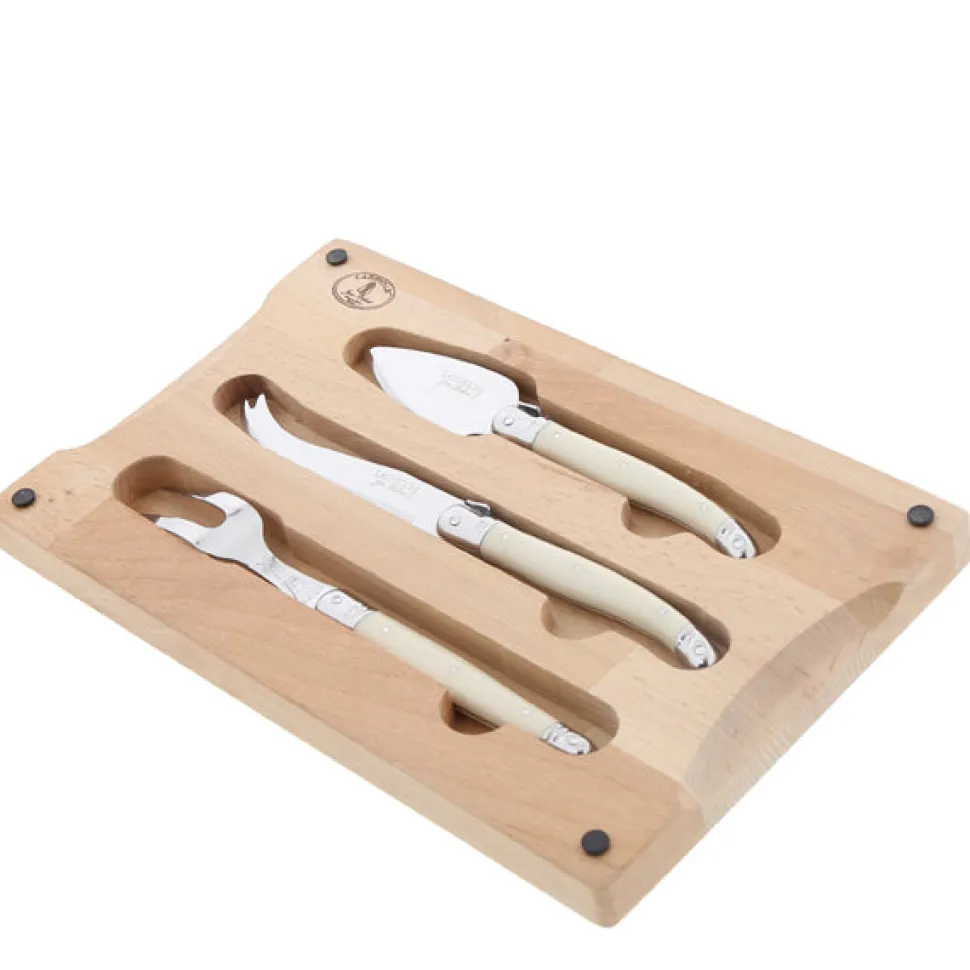 The Jean Dubost family has crafted renowned, high-quality artisan knives since 1920. Trusted in kitchens and restaurants throughout France, the legendary Laguiole tradition has now gone global. The 3-Piece Cheese Set with a Board is made of high-grade stainless steel. All Laguiole products are engraved with a historic bee, which was originally part of Napoleon Bonaparte’s imperial seal.