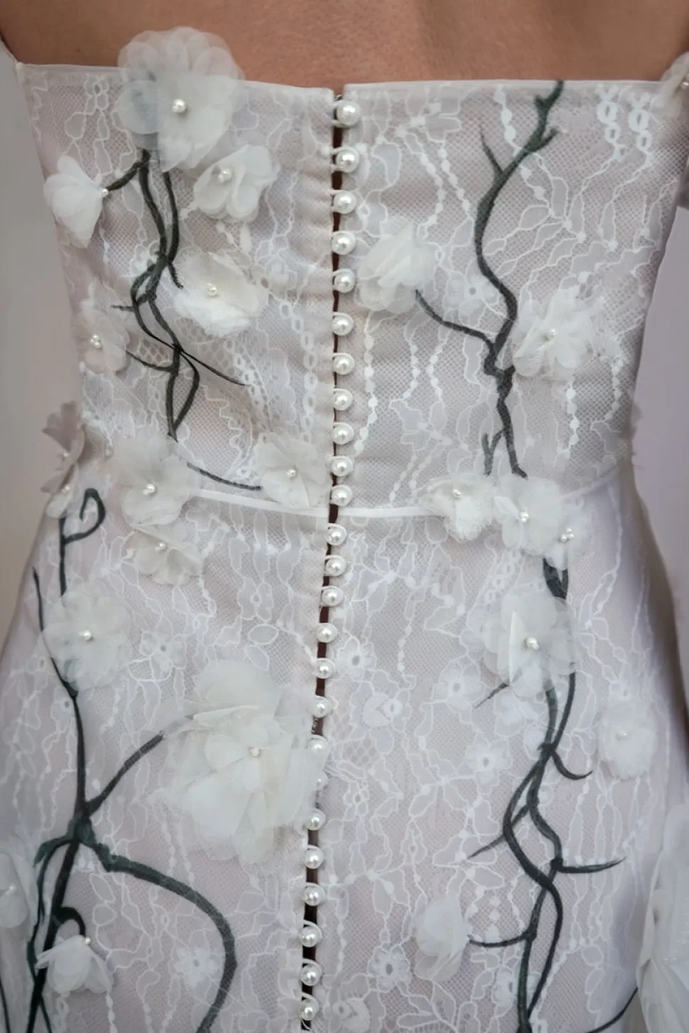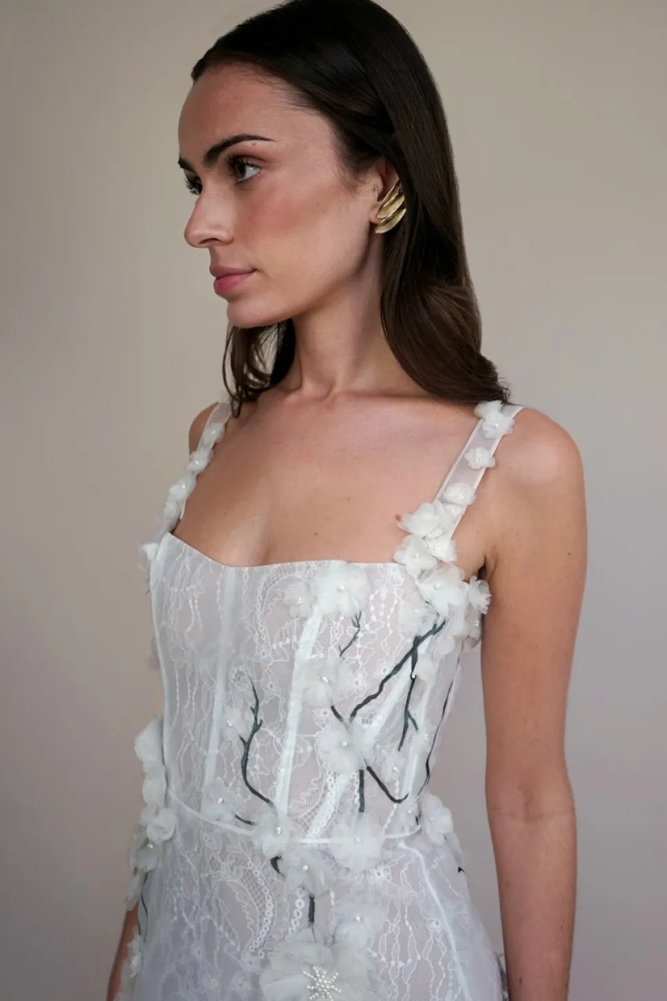 Renowned for her exquisite, artful collections, British designer Hermione de Paula brings experience from the world’s leading couture houses to her namesake bridal wear. Surrealist prints, elaborate hand-drawn artwork, and intricate embroidery come together by a luxurious, artisanal hand in every one of these romantic creations. The 3D Flower Vine Mini is a divinely inspired party mini with a dipped sweetheart neckline bodice, and boasting a 3D white blossom, as well as enticing vines as decoration.
