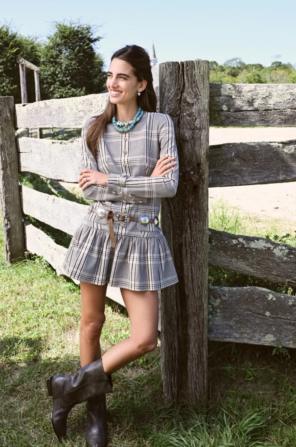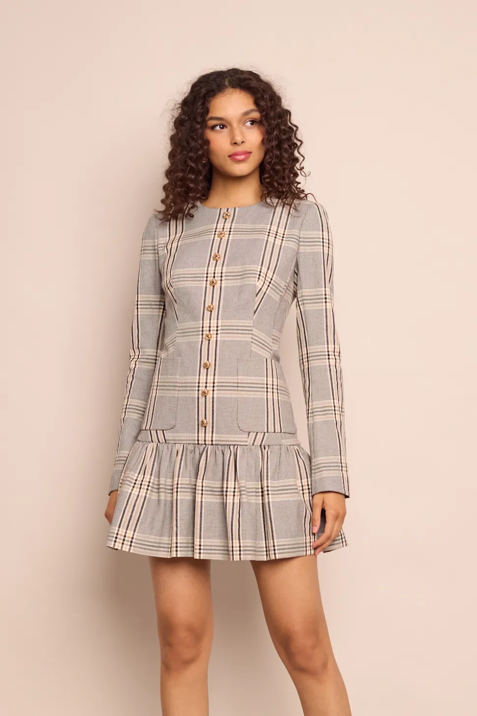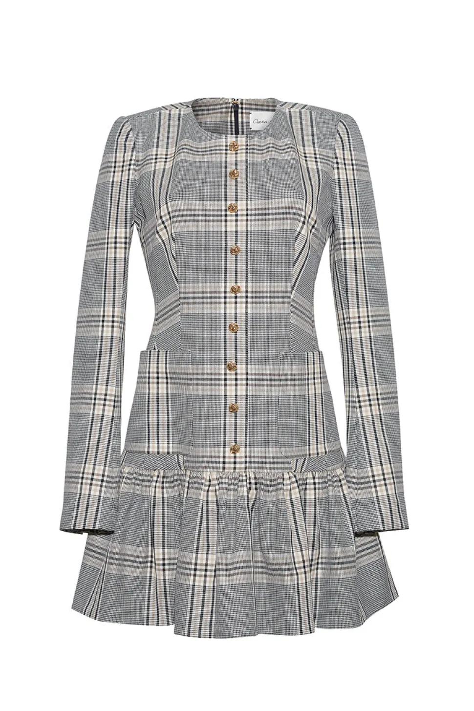 Founded by three New York City-based mothers who met through their kids, Cara Cara’s hallmarks include crisp poplin, house-designed prints, and casual glamour. The inspiration for their ethical womenswear comes from interior design, as well as the world’s most exotic locales. The Adams Dress in Raymond Plaid is a mini dress designed for a fit-and-flare silhouette. It features a lined body with unlined sleeves, a center front placket and sleeves adorned with nonfunctional buttons, and a ruffle detail at the hem. Patch pockets at the skirt and yoke, along with darts at the front and back bodice, create a fitted and structured look. A center back zipper completes this charming piece, all rendered in a placed plaid pattern.