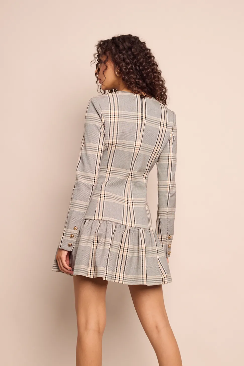 53% cotton, 41% rayon, 6% spandex. Mini dress with lined body and unlined sleeves. Fit-and-flare silhouette. Center front placket and sleeves with nonfunctional buttons. Ruffle at hem. Patch pockets at skirt and yoke. Darts at front and back bodice. Center back zipper. Placed plaid.