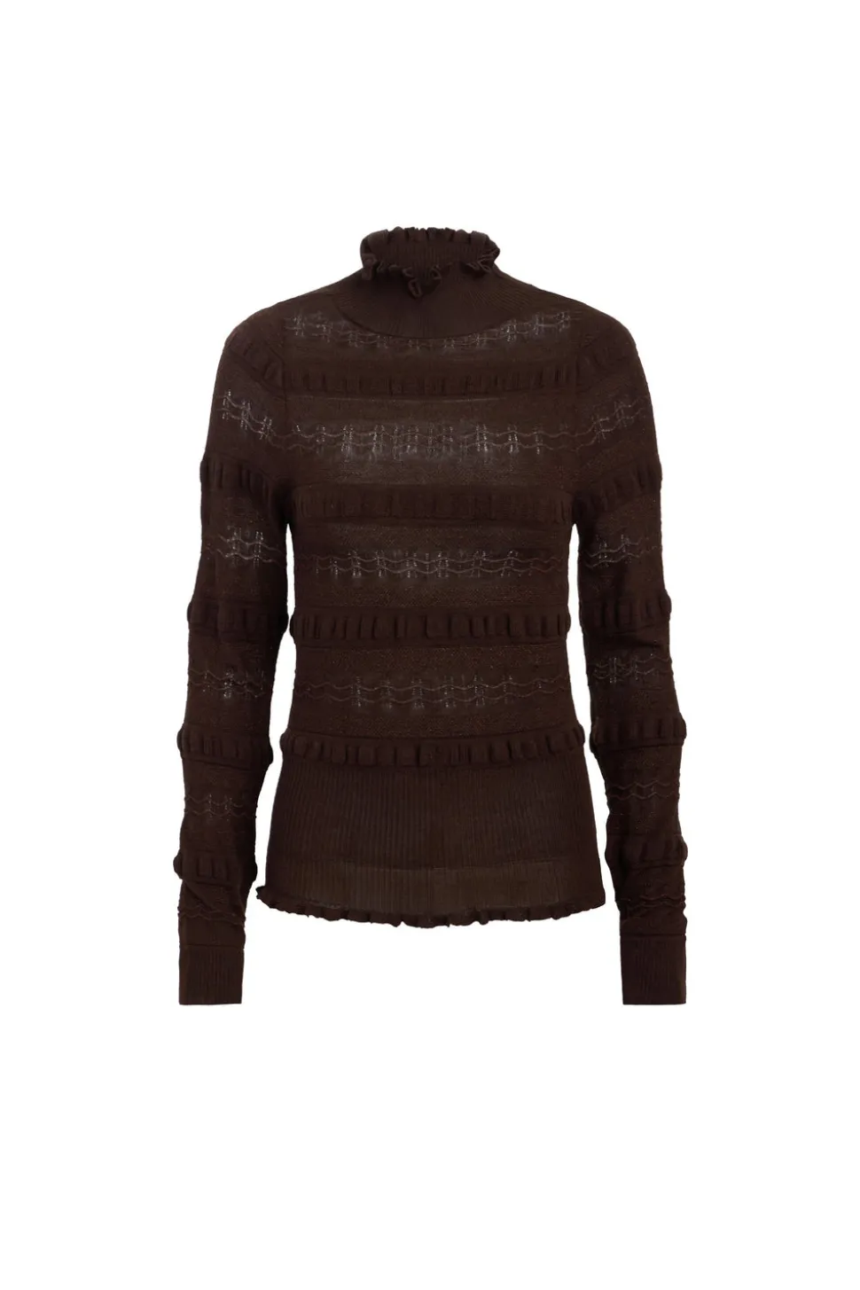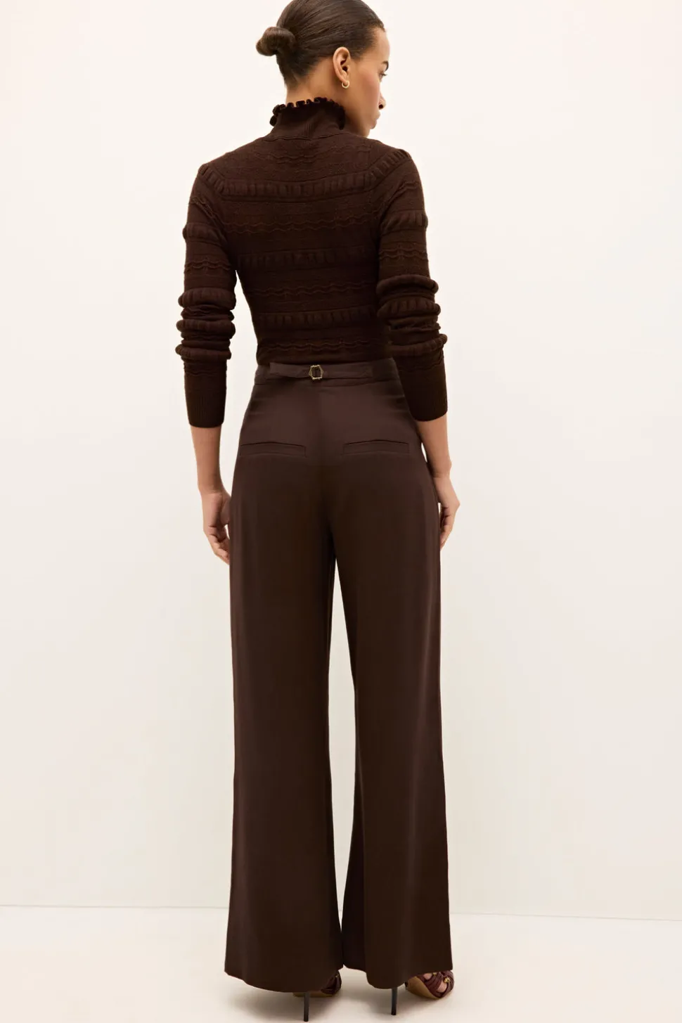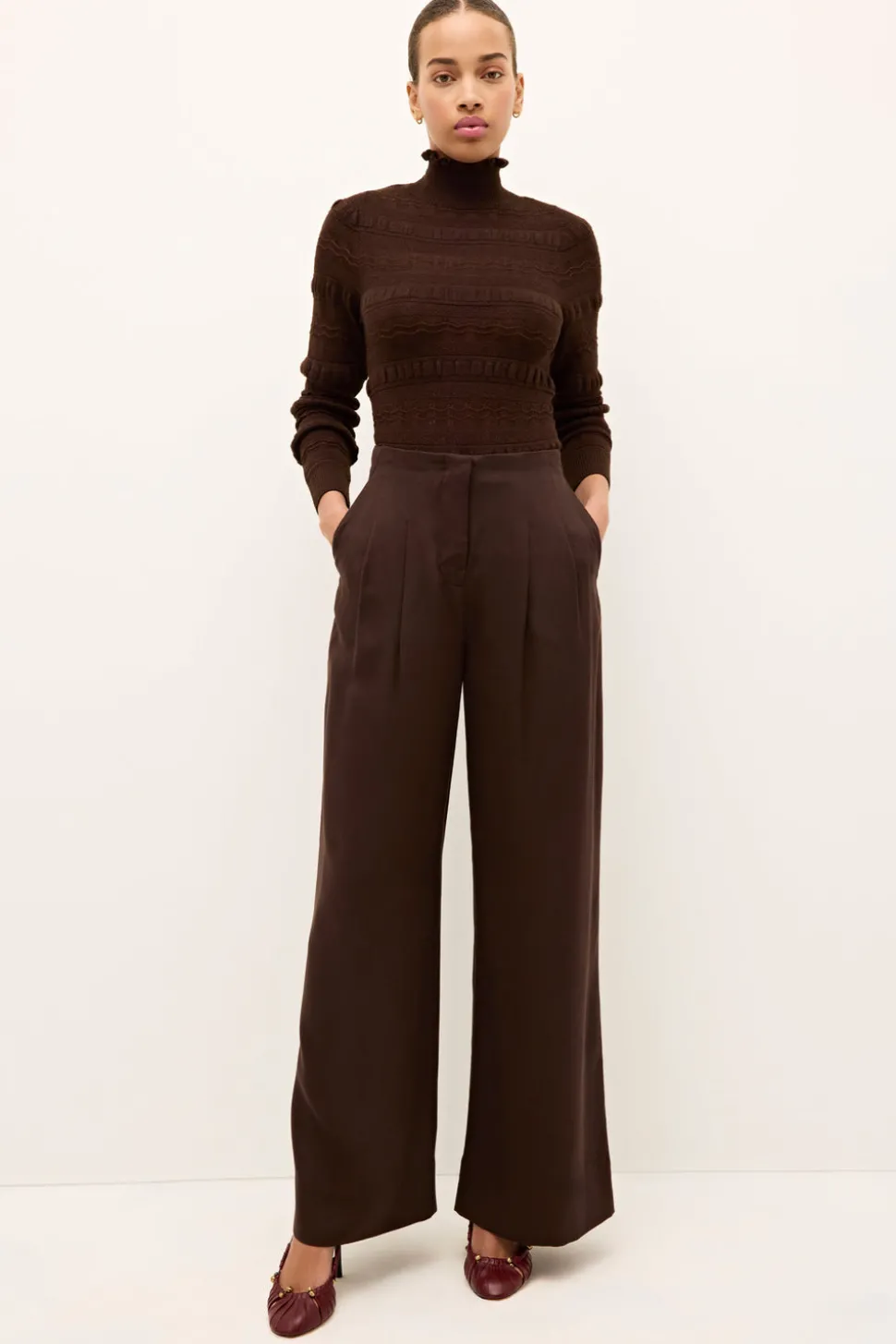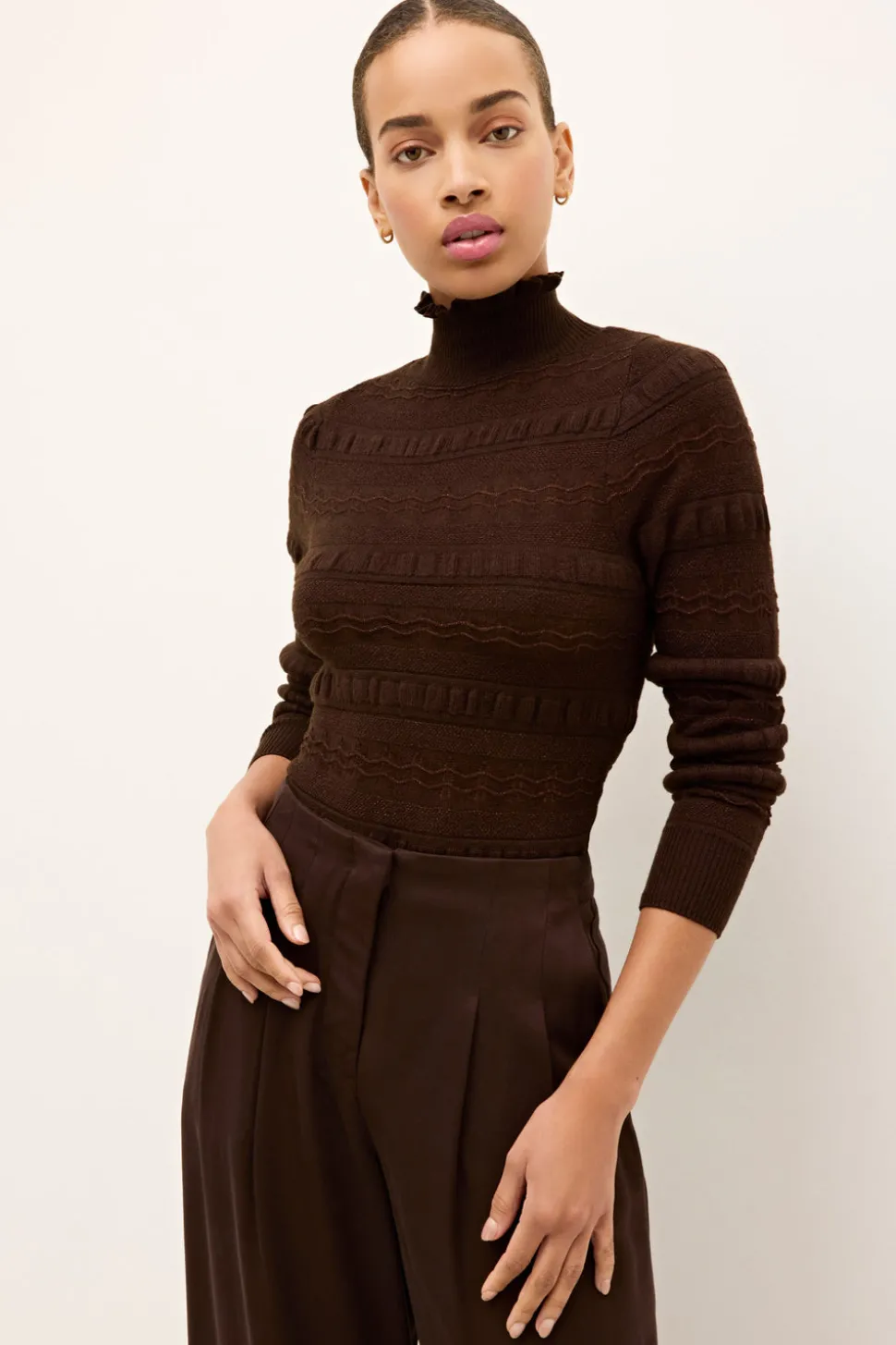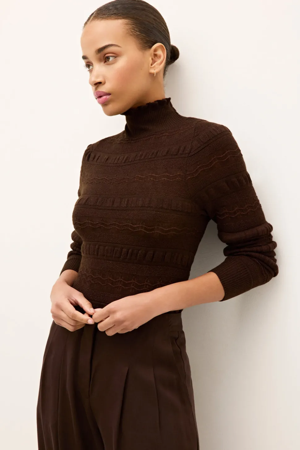 Empowering women through vivid hues and the joy of style, Sarah Doggett Evenson uses her archive of artistic prints, fine fabrics, and flattering silhouettes to make each Marie Oliver piece instantly uplifting. The Addison Top in Sepia gives the utilitarian turtleneck a feminine upgrade with folded ruffle details and a delicate pointelle knit woven with metallic yarn for subtle shimmer. Rendered in rich dark brown—this season’s most underrated neutral—it pairs effortlessly with the matching Macbee pant in Walnut for a sophisticated tonal ensemble.