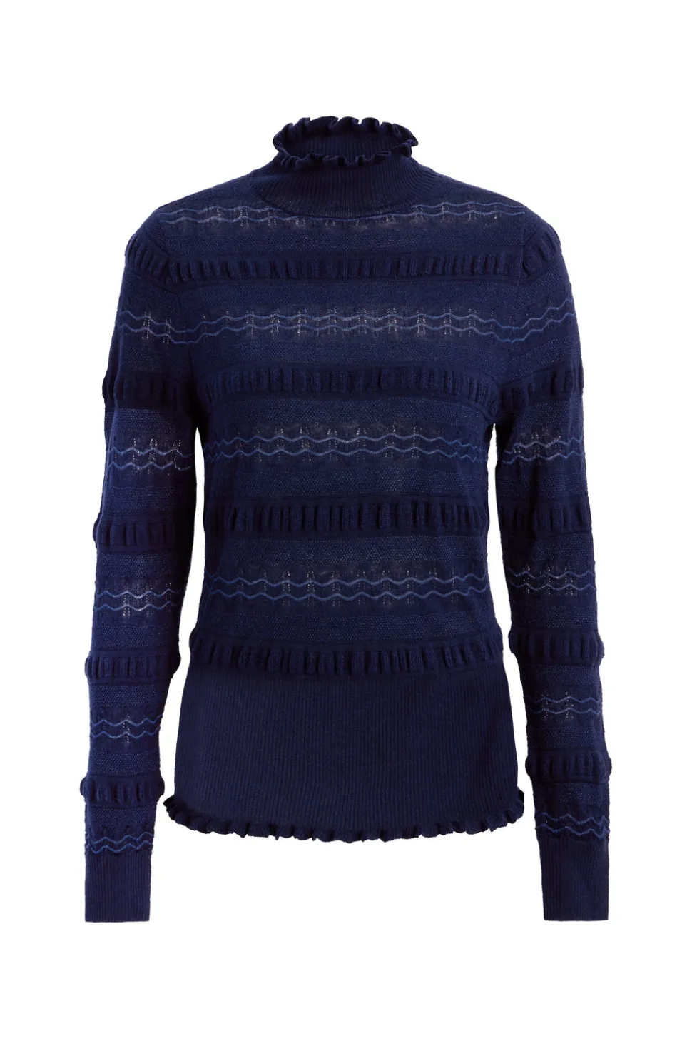 70% wool, 24% silk, 4% polyester, 2% lurex. Fold-over ruffle turtleneck. Fitted through body and sleeves. Delicate pointelle knit with subtle shimmer. Unlined.
