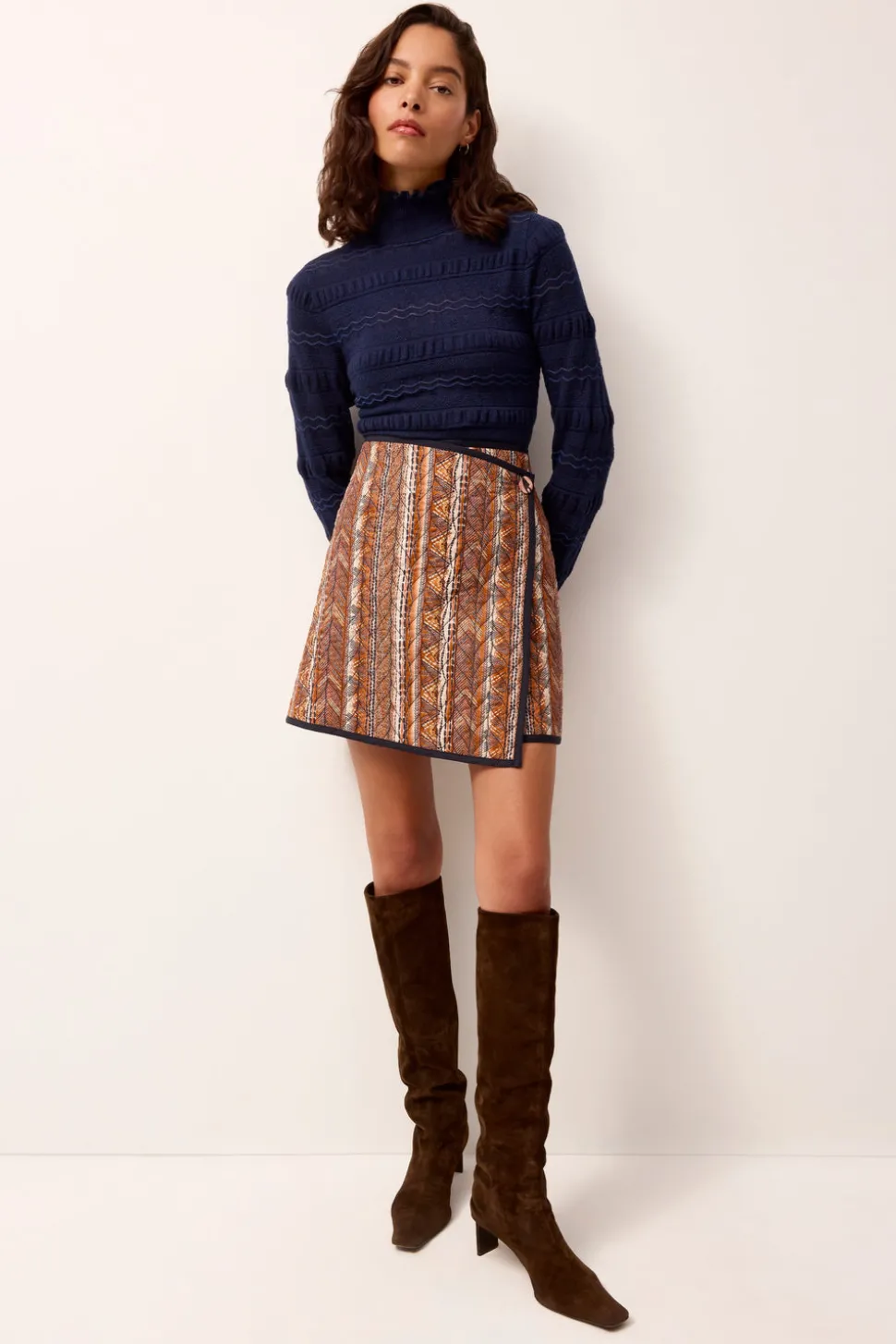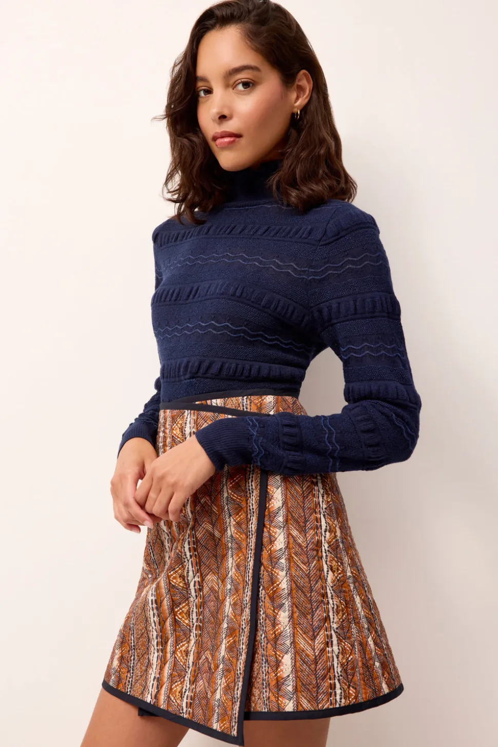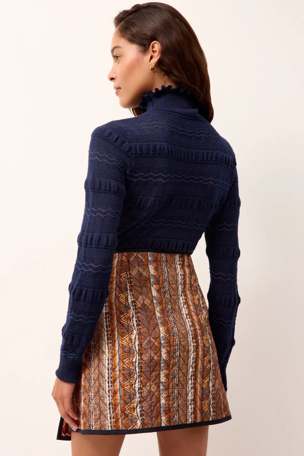 Empowering women through vivid hues and the joy of style, Sarah Doggett Evenson uses her archive of artistic prints, fine fabrics, and flattering silhouettes to make each Marie Oliver piece instantly uplifting. The Adison Top in Pacific is a body-skimming turtleneck elevated with allover folded ruffle details and a delicate pointelle knit woven with metallic yarn for a subtle shimmer. The deep Pacific hue strikes a balance of feminine charm and seasonal sophistication, pairing beautifully with contrasting textures and autumnal tones.