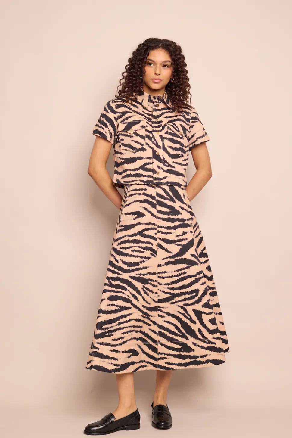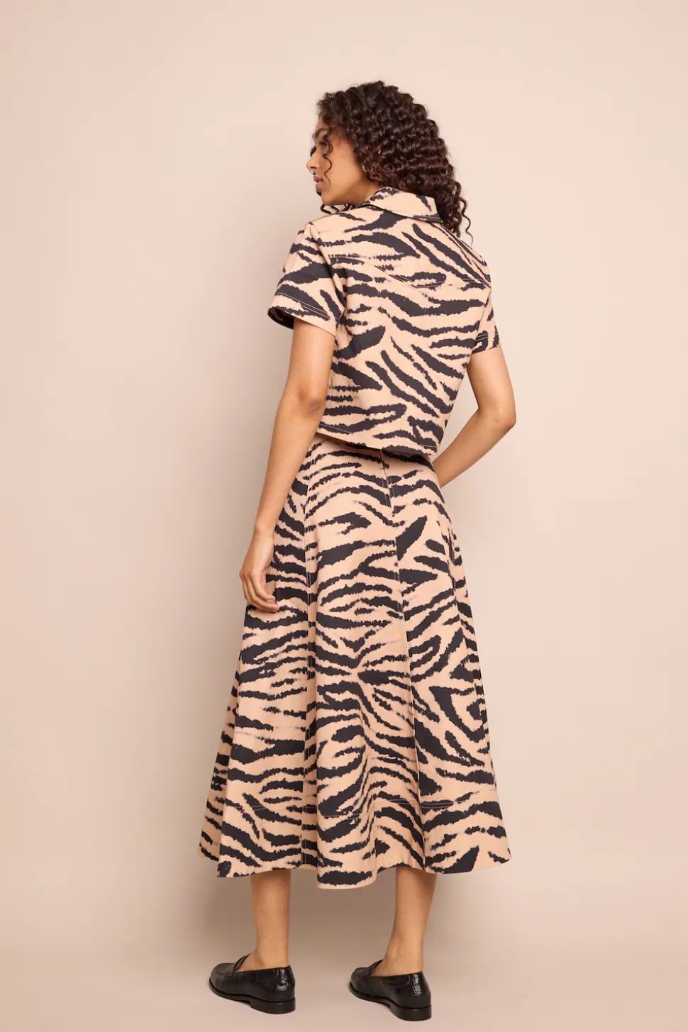 Founded by three New York City-based mothers who met through their kids, Cara Cara’s hallmarks include crisp poplin, house-designed prints, and casual glamour. The inspiration for their ethical womenswear comes from interior design, as well as the world’s most exotic locales. The Aisha Skirt in Zebra Blush offers a bold take on a classic flared silhouette. Crafted in printed cotton canvas, it features paneled construction with topstitch detailing, functional side-seam pockets, and a wide facing at the hem. Designed for movement and ease, it’s an effortlessly striking midi for both casual and elevated looks.