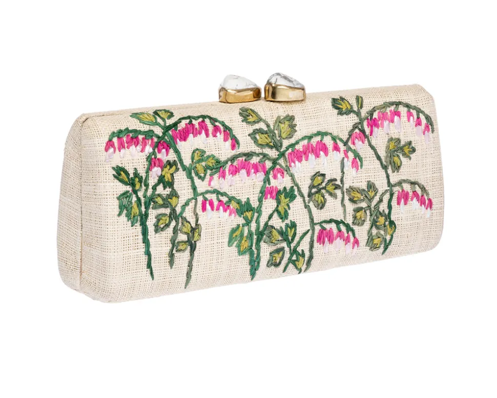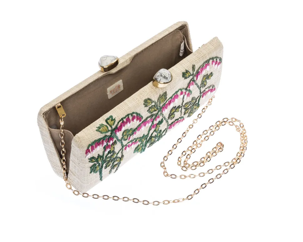 Rafe Totengco finds inspiration in architectural forms the world over for his exquisite minaudières and clutches. Born in the Philippines and based in New York city, Totengco weaves multi-cultural references into his carefully detailed accessories, which impart not only a sense of everyday glamour, but that of objects d’art. A long clutch, crafted in natural rattan “solhiya” caning, with hand-embroidered fuchsia bleeding hearts, the Alessandra Clutch in Fuchsia features an ivory stone kiss-lock closure, and a gold chain shoulder strap.