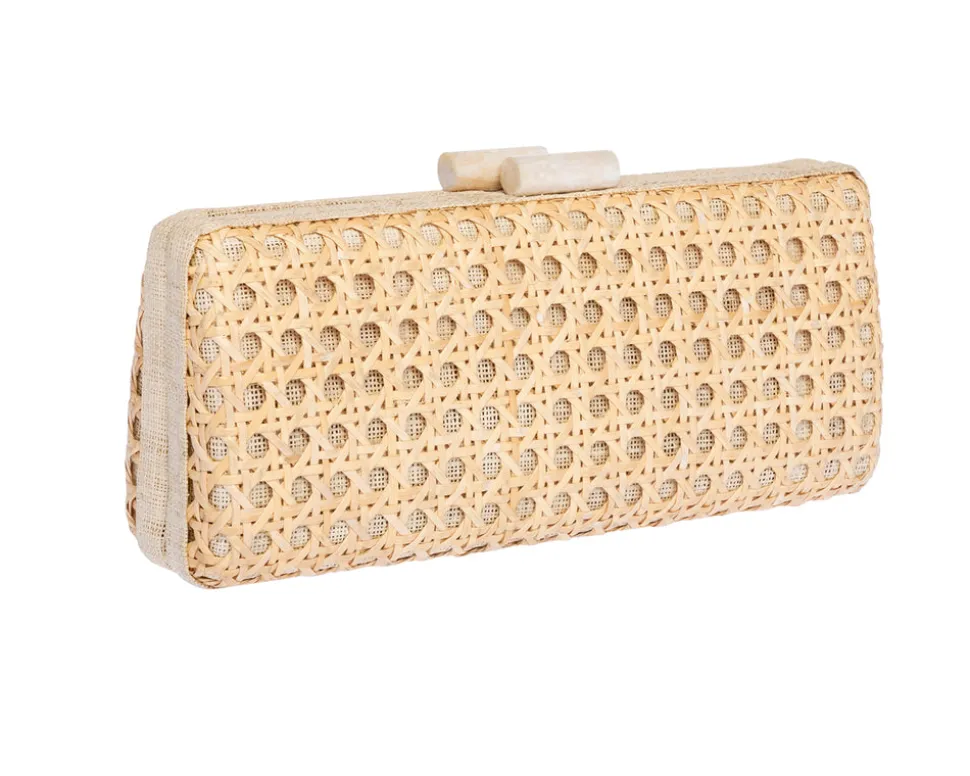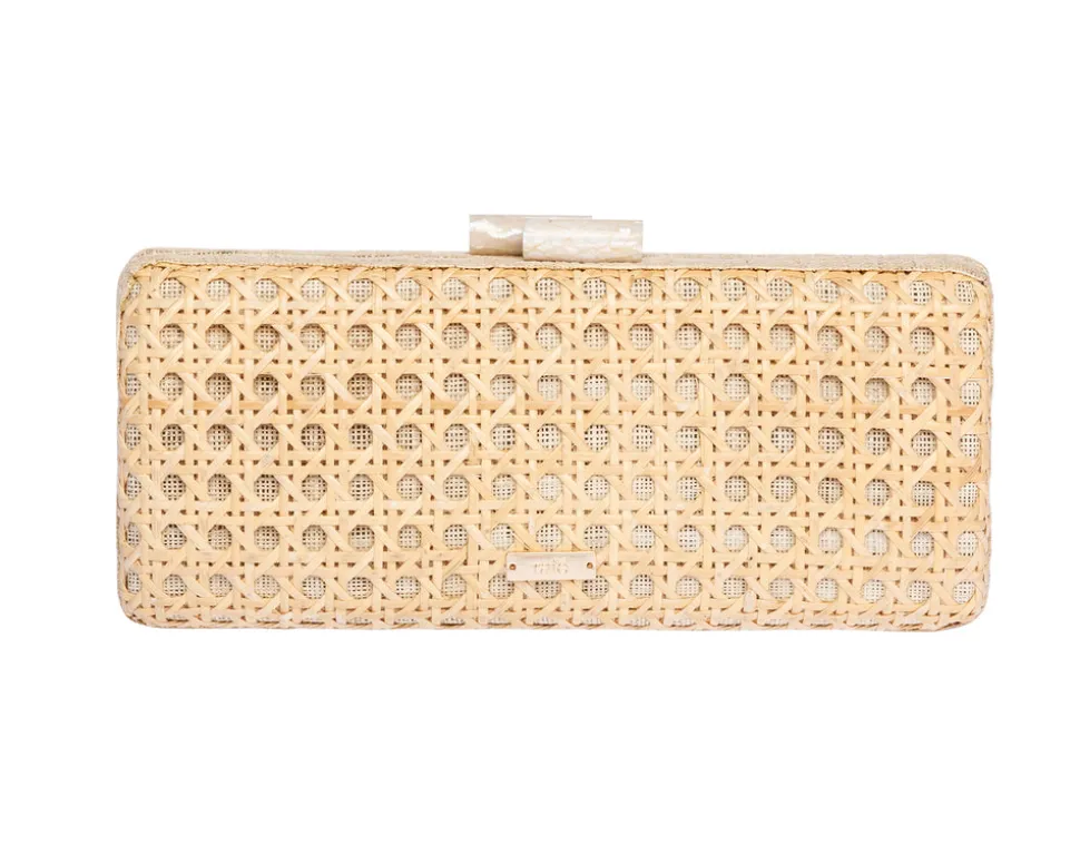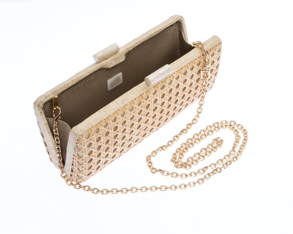 Rafe Totengco finds inspiration in architectural forms the world over for his exquisite minaudières and clutches. Born in the Philippines and based in New York city, Totengco weaves multi-cultural references into his carefully detailed accessories, which impart not only a sense of everyday glamour, but that of objects d’art. A long clutch, crafted in natural rattan “solhiya” caning, with ivory raffia trim, the Alessandra Clutch In Ivory features a shell inlay kiss-lock closure, and a gold chain shoulder strap.