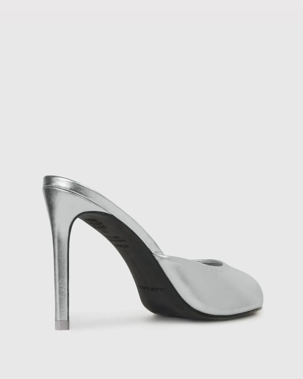 Founded by Kris Avakia in Montréal, Black Suede Studio fuses heritage, passion, and fine craftsmanship to form a line of forward-thinking, luxury footwear. A round toe slipper mule, set on a straight stiletto heel, the Alessia in Silver Metallic Leather is crafted in a metallic finished leather for sophistication, and a little flash, in every step.