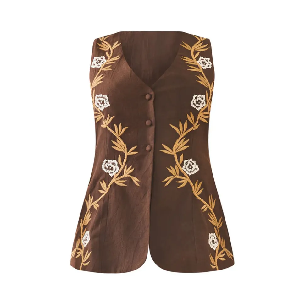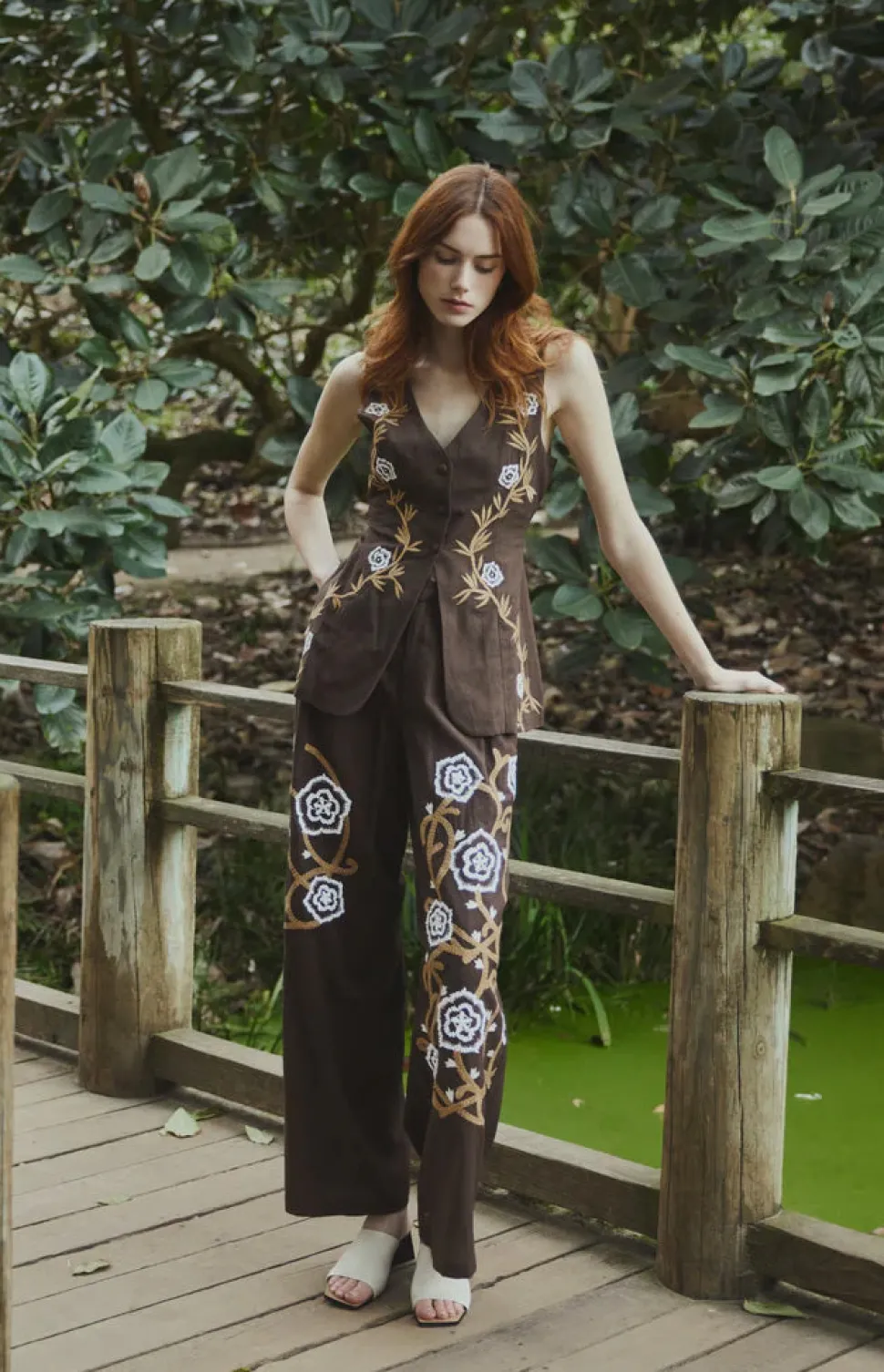 Tomboy looks, girly-girl styles, and an always fashionable approach define Eddy’s aesthetic. With a focus on bold and feminine silhouettes, Eddy dresses and tops pair elevated California bohemian with global inspiration; these are clothes designed to make you feel good inside and out. The Alexa Top in Chocolate Martini is a chic, tailored vest made of cotton linen with a button closure. Natural raffia floral embroidery weaves its way from shoulder to waist hem.