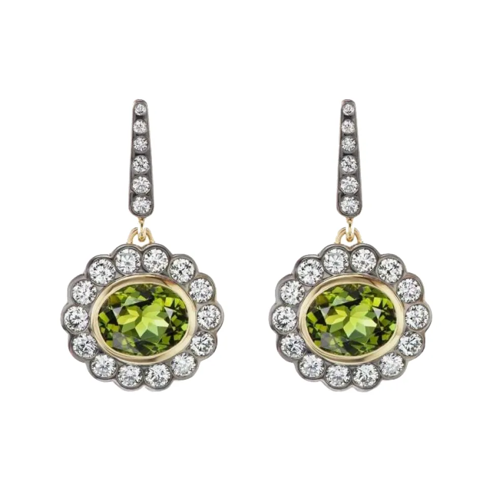 Made in Manhattan, with love and only the finest materials, Marlo Laz jewels are modern heirlooms and precious talismans. They are thoughtfully designed for those bohemians who carry an adventurous spirit, and the finest taste.The Alexandra Earrings Green Tourmaline hail from the Minerva Collection, a salute to the Greek goddess of wisdom and the arts. Here you become your own muse, with gorgeous green tourmaline, surrounded by white diamonds, set in blackened Yellow Gold. Magic, wisdom, and beauty at every turn.