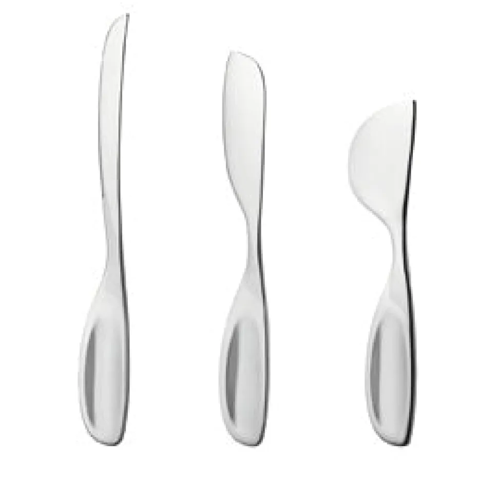 For over a century, Georg Jensen has developed jewelry, silverware, and home decor with purposeful, timeless, and functional beauty in mind. Rooted in Scandinavia, and inspired by the lines of Art Nouveau, the brand innovates, sustainable, unmistakable design with a distinctive vigor and unmatched quality. Designer Alfredo Häberli worked with Georg Jensen to create a range of kitchen and dining room products that import not only functionality but light-hearted personality. Organic shapes and a flat handle define the always elegant Alfredo Cheese Knives Stainless Steel, Set of 3, ideal for soft and hard cheeses, and everything in between.