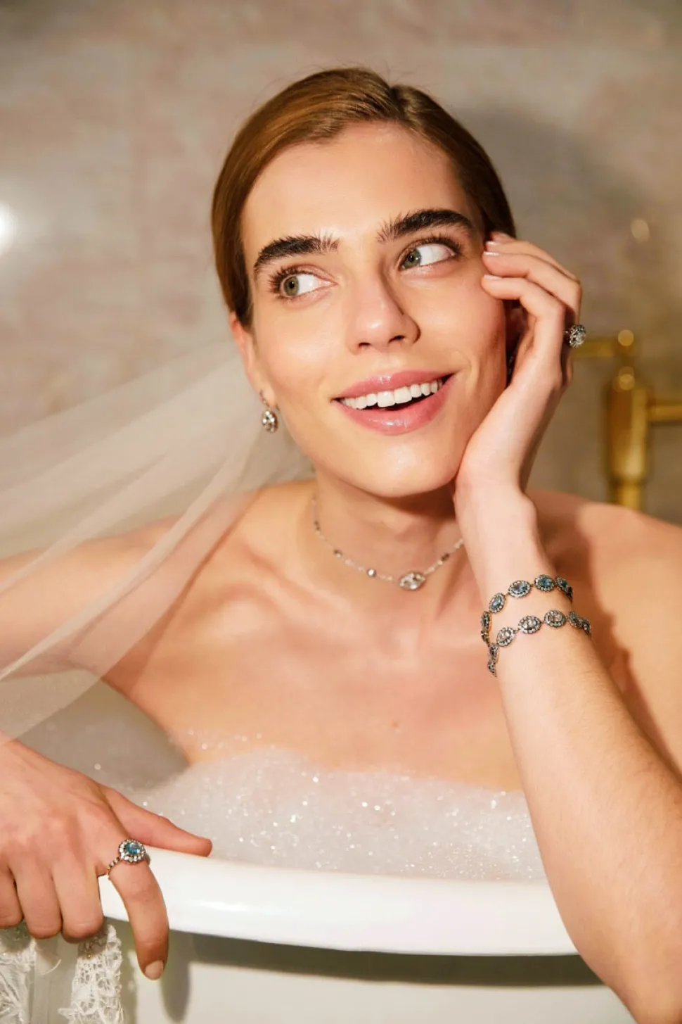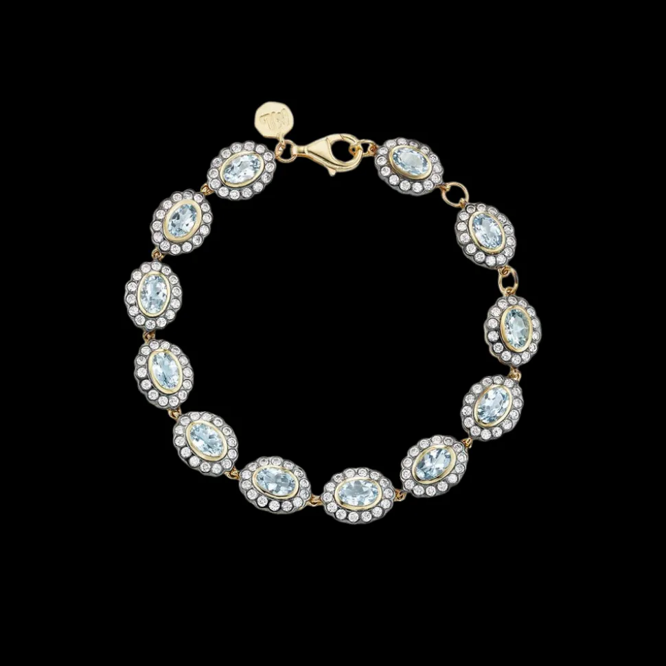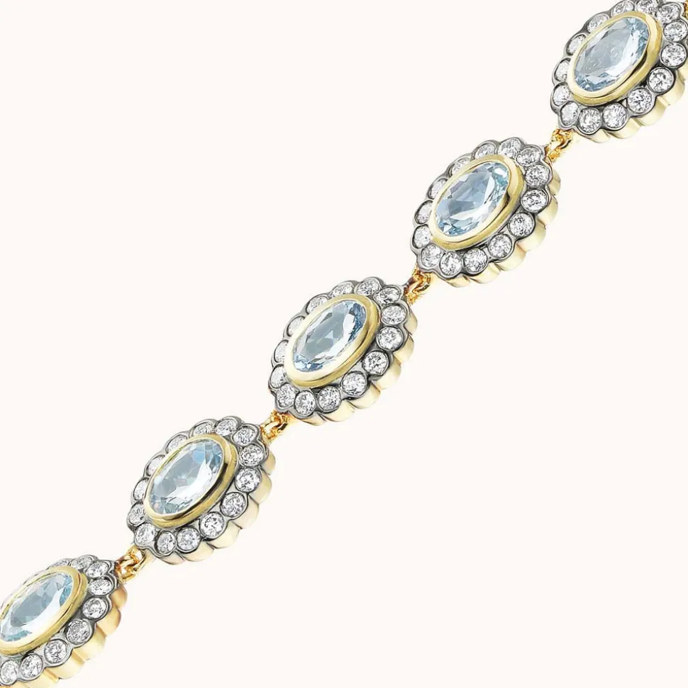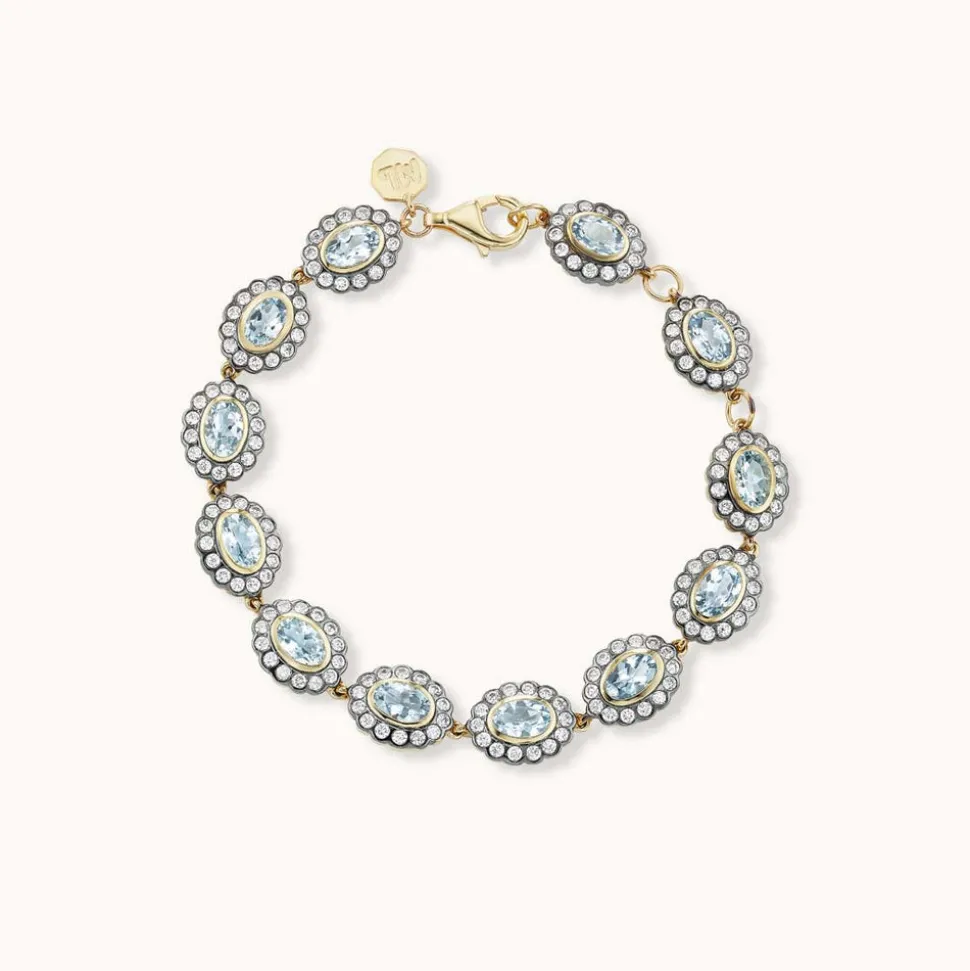 Made in Manhattan with love and only the finest materials, Marlo Laz jewels are modern heirlooms and precious talismans. They are thoughtfully designed for bohemians who carry an adventurous spirit, and the finest taste. Exclusive to Over The Moon, the Ali Bracelet in Aquamarine draws on Marlo Laz’s signature Alexandra motif featuring oval-cut gemstones surrounded by a halo of bezel-set diamonds. Scaled down in size and crafted in 10-karat gold, the precious Ali Bracelet showcases a row of aquamarine stones strung together to wrap completely around the wrist.
