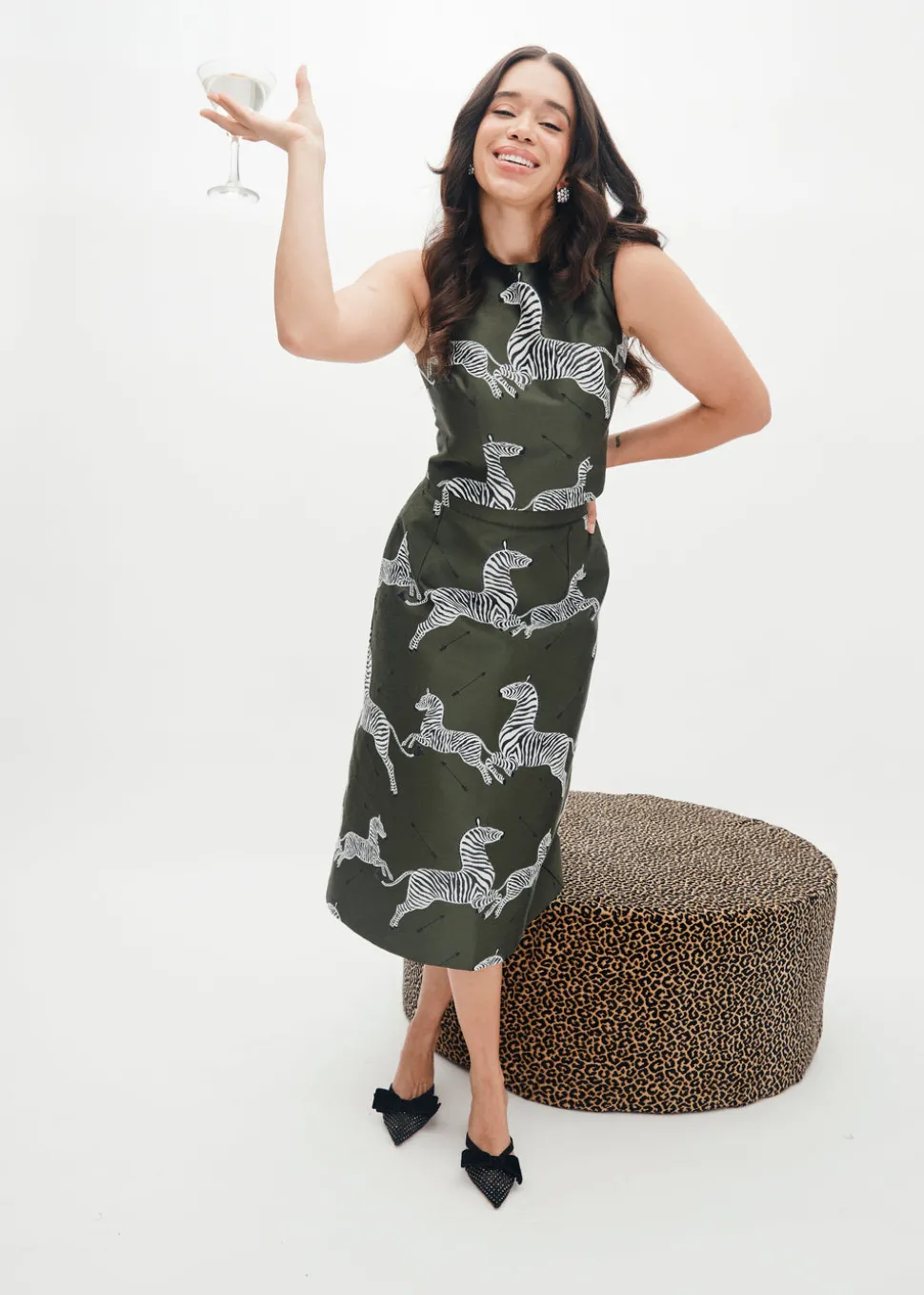 MAE New York seeks to revitalize New York’s historical garment district by creating small-batch and made-to-order collections—modern interpretations of 1960s glamor—highlighting tailoring, luxury materials, and craftsmanship. The Ali Top is a refined shell with big impact, cut in the exclusive MAE x Scalamandré Olive Zebra jacquard. Equal parts bold and elegant, it’s perfect paired with the matching Hallie Skirt as a modern cocktail set, or dressed down with denim for a more playful take. Crafted in Italy, the fabric marks a first for Scalamandré: its iconic Zebras motif—once available only as printed fabric and wallpaper—has been reimagined as a woven jacquard. Each zebra is intricately woven into the warp and finished with tonal black lurex for a subtle, sophisticated shimmer.