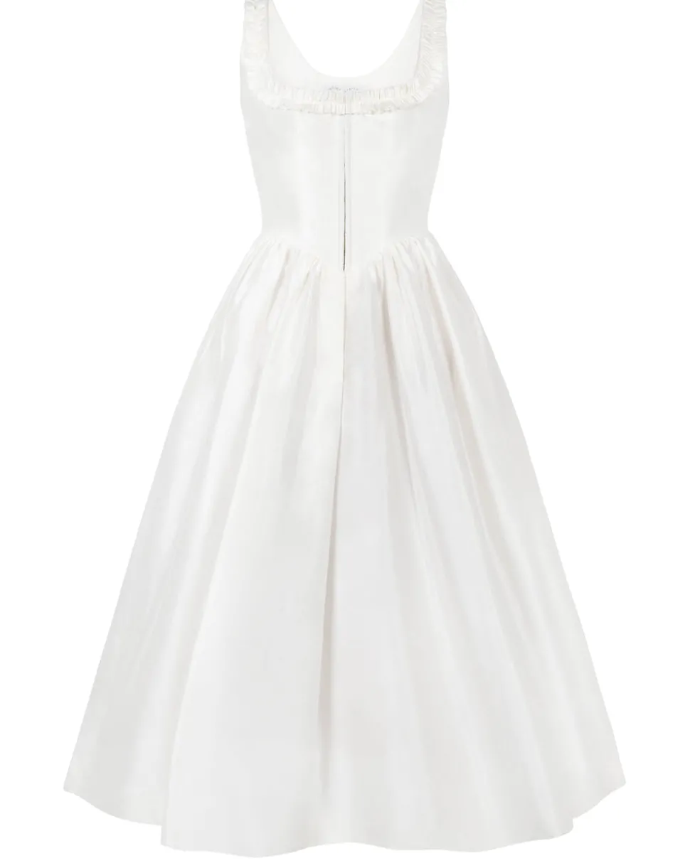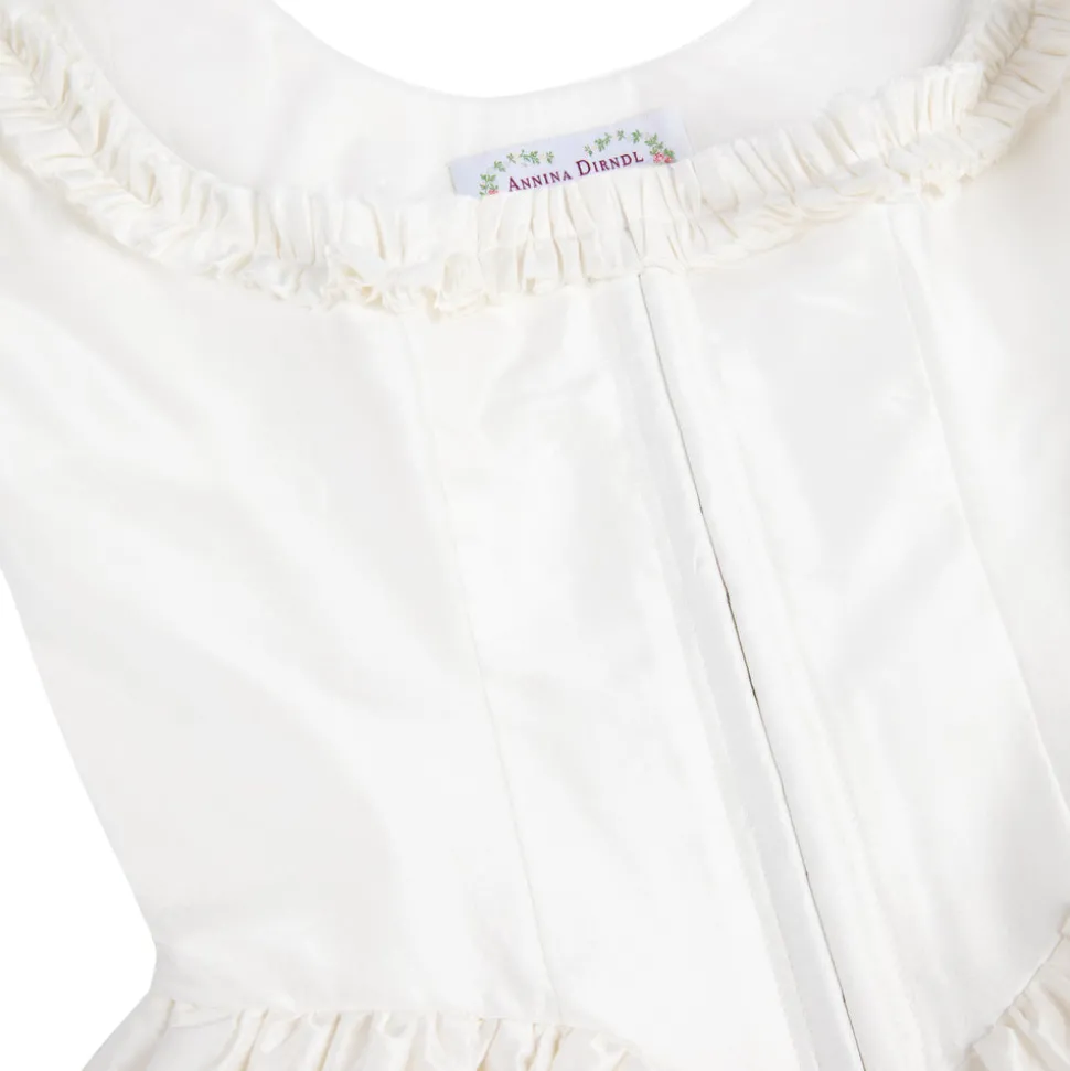 Utilizing her talents as a former designer for fashion, film, and opera productions, Bavarian-born Annina Pfuel married her love for traditional Alpine clothes with her expertise in historical costumes. Suitable across various dress codes, each handmade garment is a unique wardrobe investment, showcasing a modern-day sensibility while paying homage to a bygone era. Handcrafted from off-white silk dupion fabric, the Alice Dress in Ivory features a deep neckline embellished with a silk ruffle.