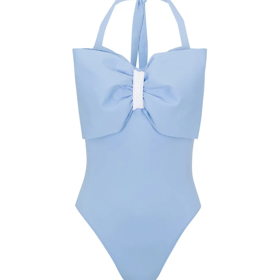 Nostalgia for the past—Brigitte Bardot films, classic Cartier pieces, Slim Aarons photographs—guides the hand of Stefana Tabacaru, the designer of Tabacaru. Made in America, sustainably, each piece features flattering cuts, clean lines, and the finest materials to help women feel like the best version of themselves. Black-tie swim—what a concept. The Alina with Bows is a stunning, light blue suit adorned with an enlarged bow across the chest. This piece is girly, feminine, and a standout look for any summer event.