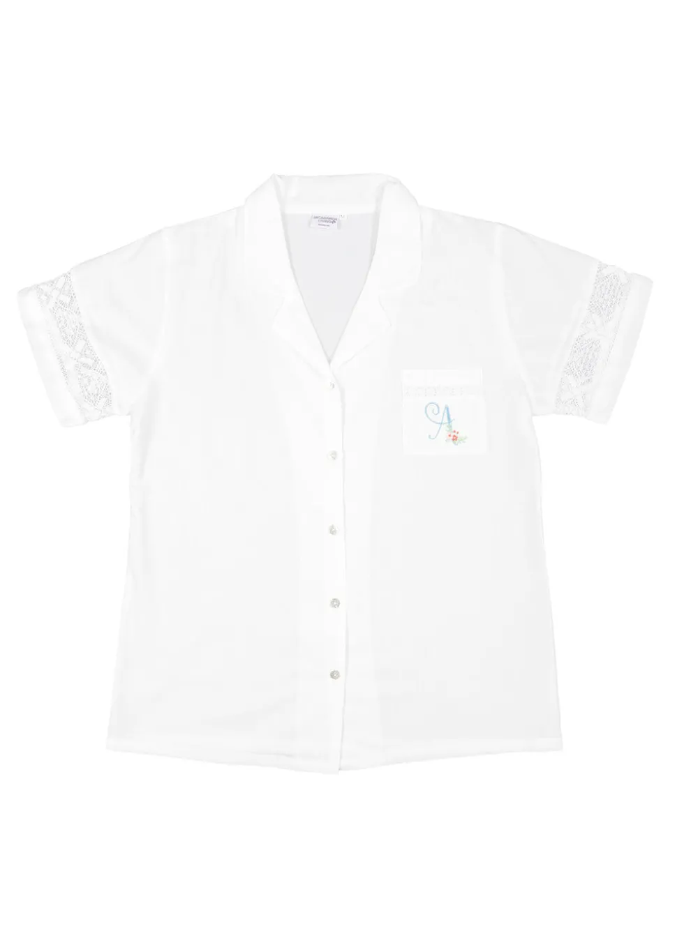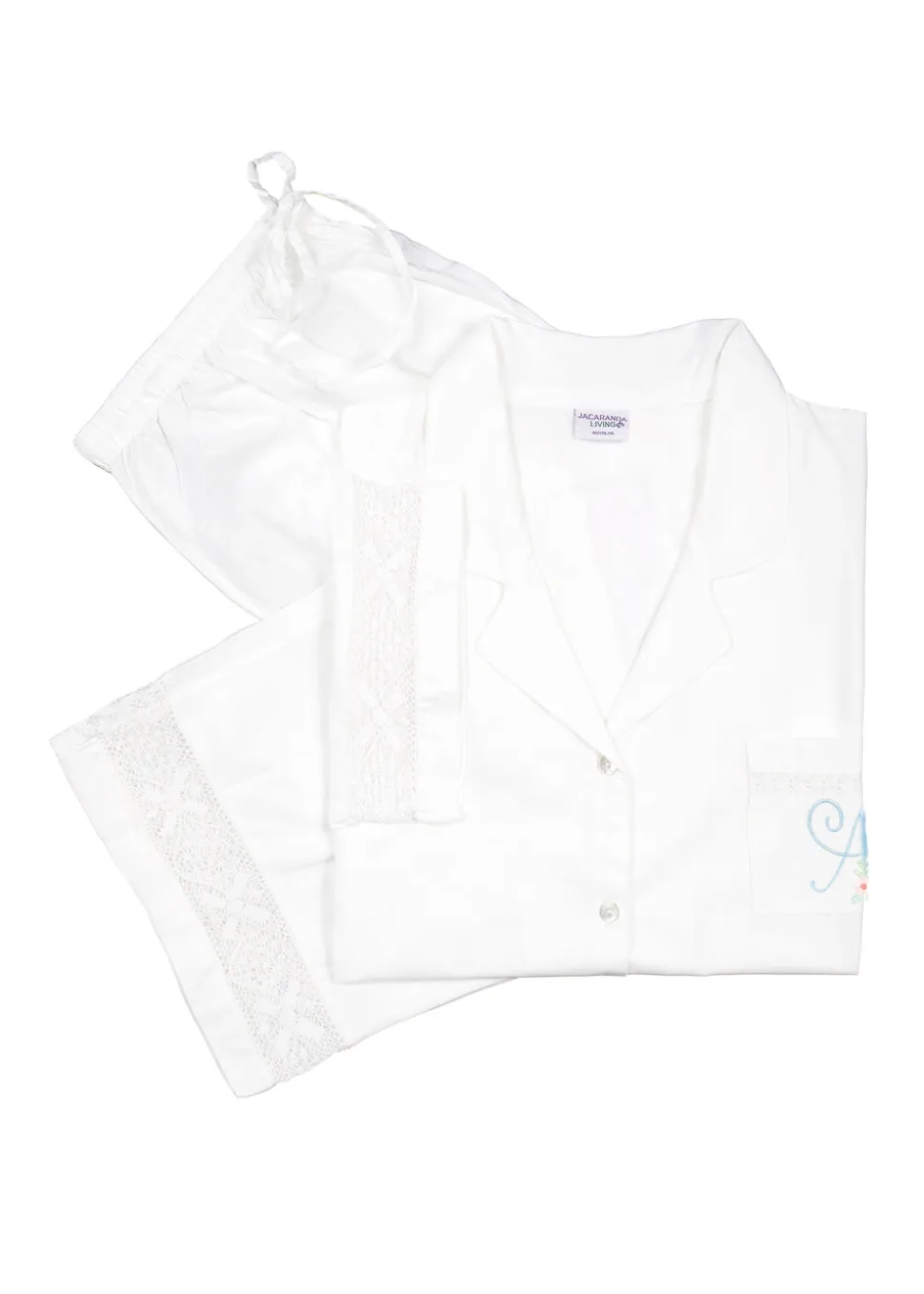 Embracing a European aesthetic of hand embroidery with elegant touches of cotton lace, Jacaranda Living produces a wide variety of high quality luxury linens—for bath, table, sleepwear, and more that feel as good as they look in your home or wardrobe. Short-sleeved and stylish, this is the perfect mid-temp PJ set. We love the french lace detail on the hem, sleeve, and pocket. Parfait! This set can be monogrammed above the pocket.