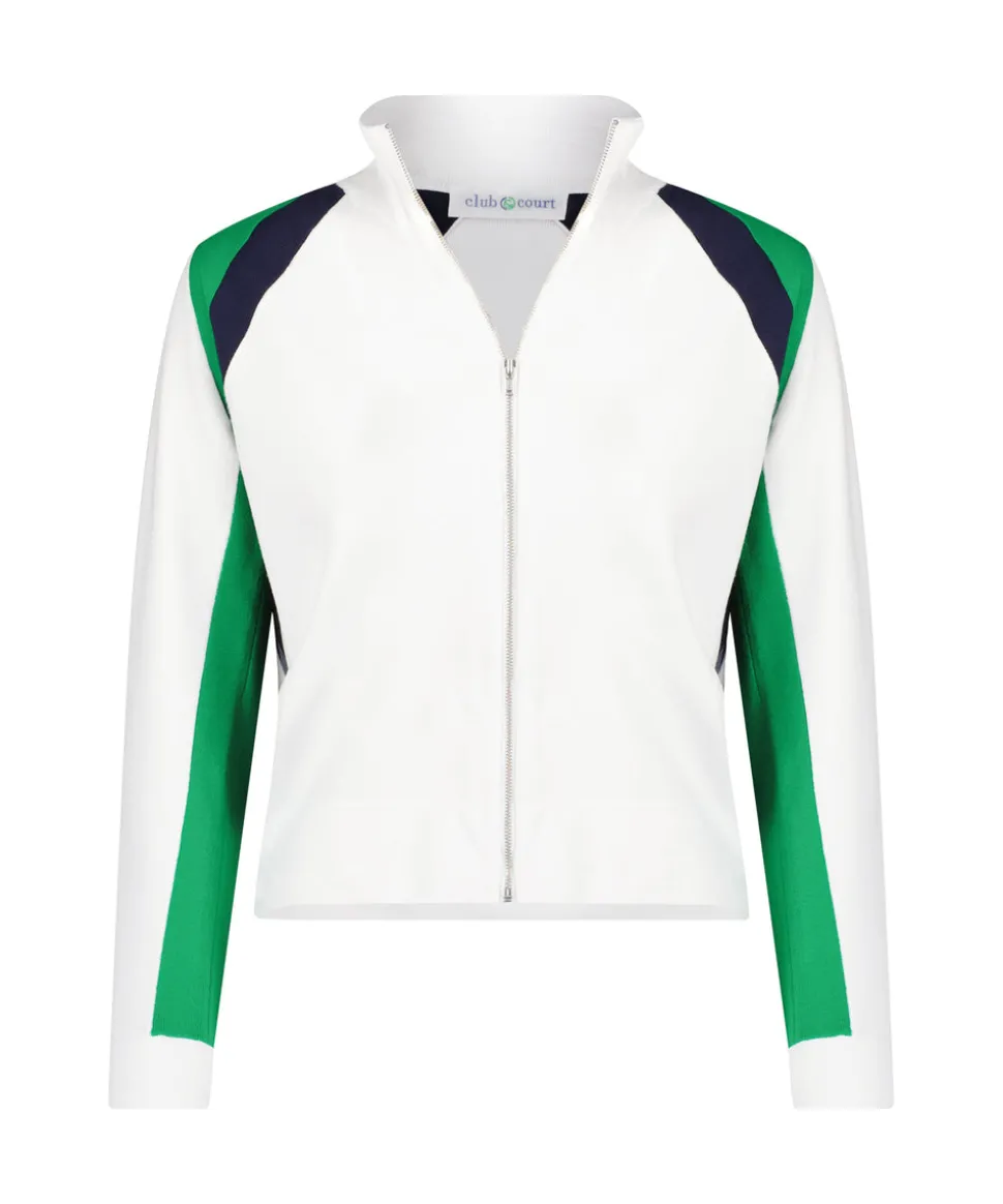 Taking inspiration from vintage tennis fashion, Club & Court employs modern fabrics and silhouettes, as well as a soft palette and bold prints to produce sporting attire, skirts and dresses that accommodate and elevate an active lifestyle. Crafted in luxurious stretch frabric and boasting classic Kelly green and navy accents, the All-Sport Club Sweater in White is flattering, soft to the touch, and is finished with a feminine sleeve length. Sporty and stylish.