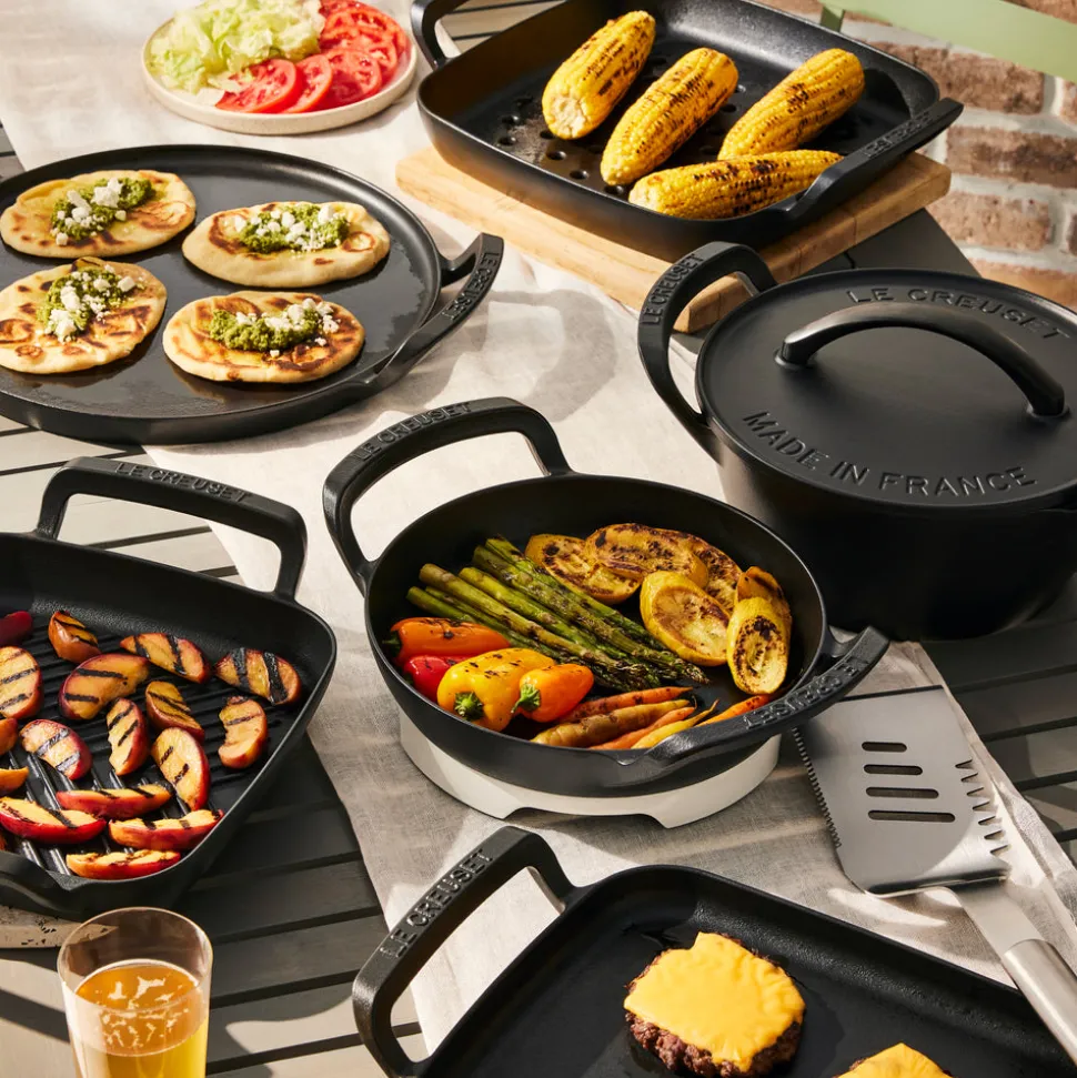 Crafted from durable enameled cast iron developed specifically for outdoor use, offering unmatched heat retention and even cooking. Finished in rugged matte black enamel that is easy to clean and requires no seasoning. Raised loop handles provide a secure grip when maneuvering over grills or campfires. The gently domed lid promotes moisture circulation, echoing the design of Le Creuset’s classic Dutch Oven. Compatible with open flame, charcoal, and gas grills.