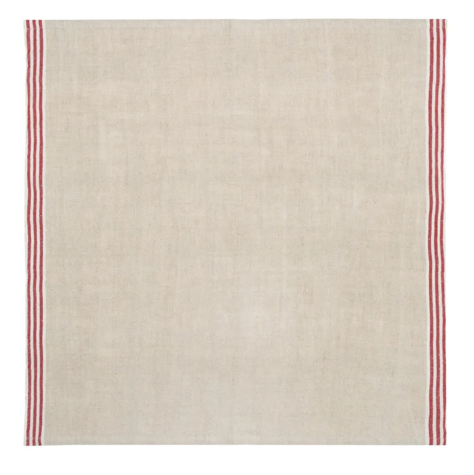 Inspired by stylistic trends from around the world, Caravan’s home accents embody an aesthetic that is both unique and unexpected, bringing everyday beauty and sophisticated simplicity to your home. Add a little classic French country to your table with the handsome Alsace Natural Napkins in Natural & Red, Set of 4. These table linens feature a three stripe border against a natural linen pallet, ensuring an effortless tablescape. Bon appétit!