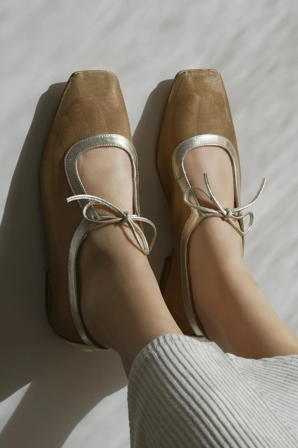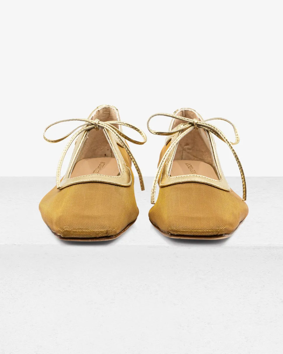 Launched in 2017, Andrea Gomez is driven by a two-fold mission of creating refined, timeless footwear and providing essential resources to Venezuelan children in need. Drawing inspiration from the undeniable beauty of Venezuela, the Andrea Gomez collection is inspired by, thoughtfully designed by and created for women. A modern take on the classic ballerina, the Amelia Clear Mesh Gold is made from clear mesh with a foot-hugging design and a bow-tied vamp strap.