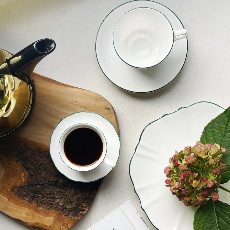 NYC-based Twig New York is known and loved for its range of fine bone china created by a team of artists and designers who are dedicated to quality and who believe that ordinary moments can be some of the most beautiful. Punctuate any meal with your favorite high-quality coffee in the Amelie Forest Green Espresso Cup and Saucer Set. With its hand-painted rim, this is an ideal demitasse for guests or yourself.