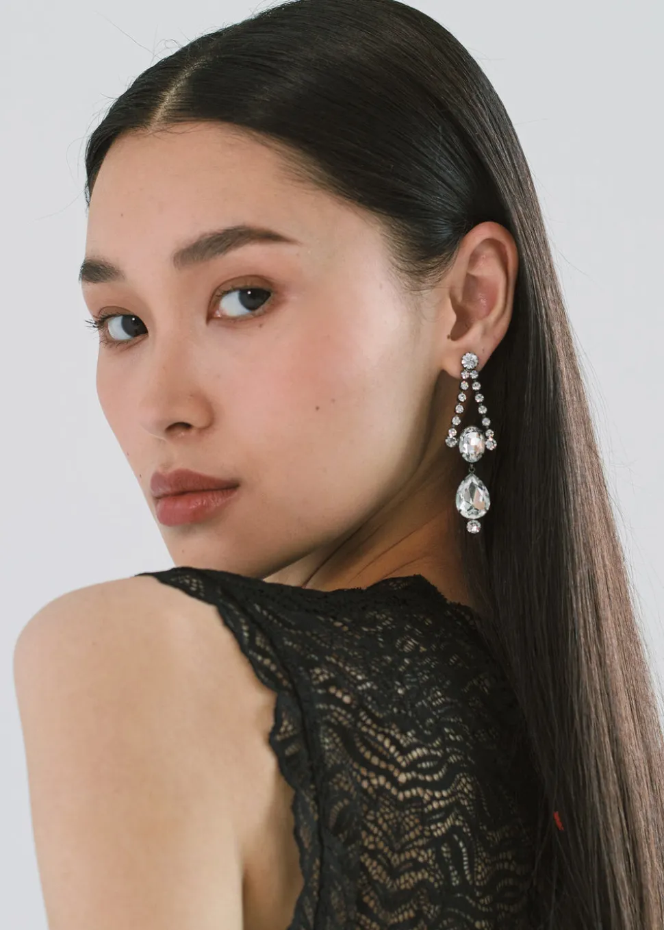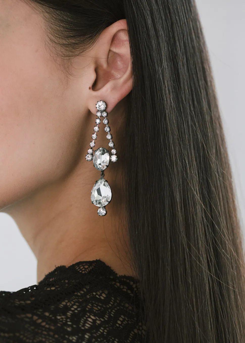 Handmade in New York from gunmetal plated brass and crystal. Surgical-steel post, nickel-free, and safe for sensitive skin.