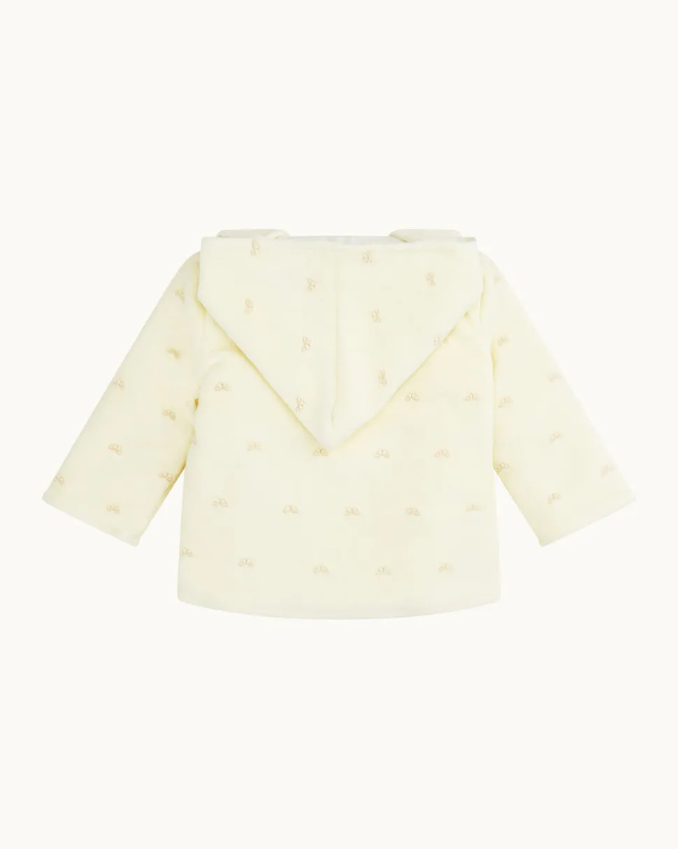 Princess Marie-Chantal of Greece’s eponymous label is known internationally for its unmatched style and the quality of materials—like their organic, hand-picked Pima cotton—which lies at the heart of their baby essentials and contemporary children’s clothing. The Angel Wing Pram Jacket is made from the softest velour and snug hood, this is the sweetest addition to keep your little one cozy and warm. The iconic angel wing is stitched across the jacket in beautiful gold detail and a small tie for easy dressing and a snug fit.