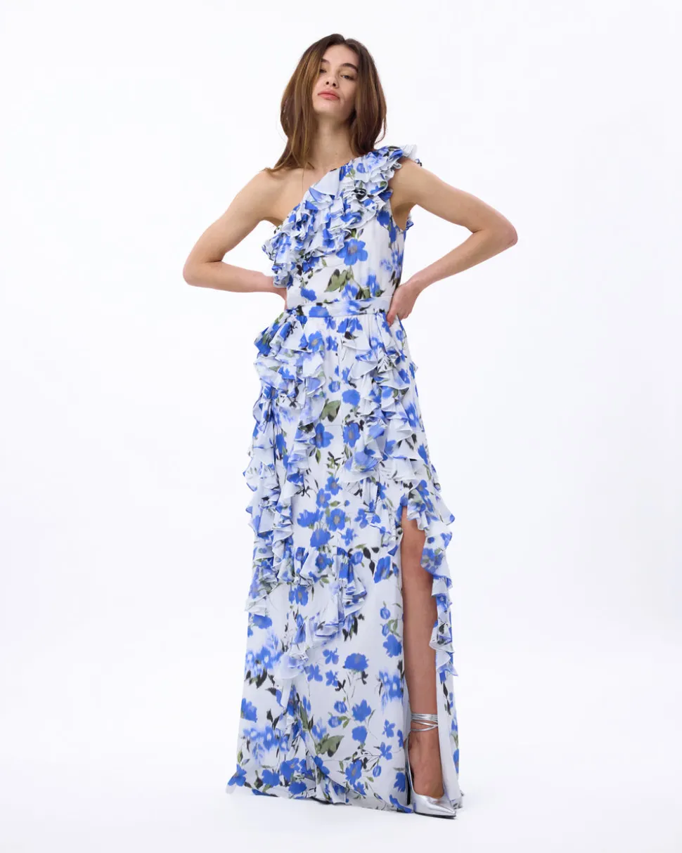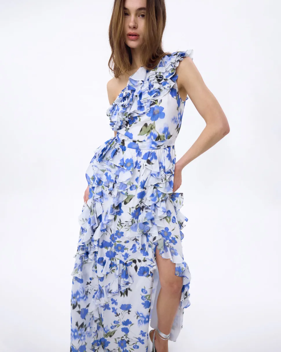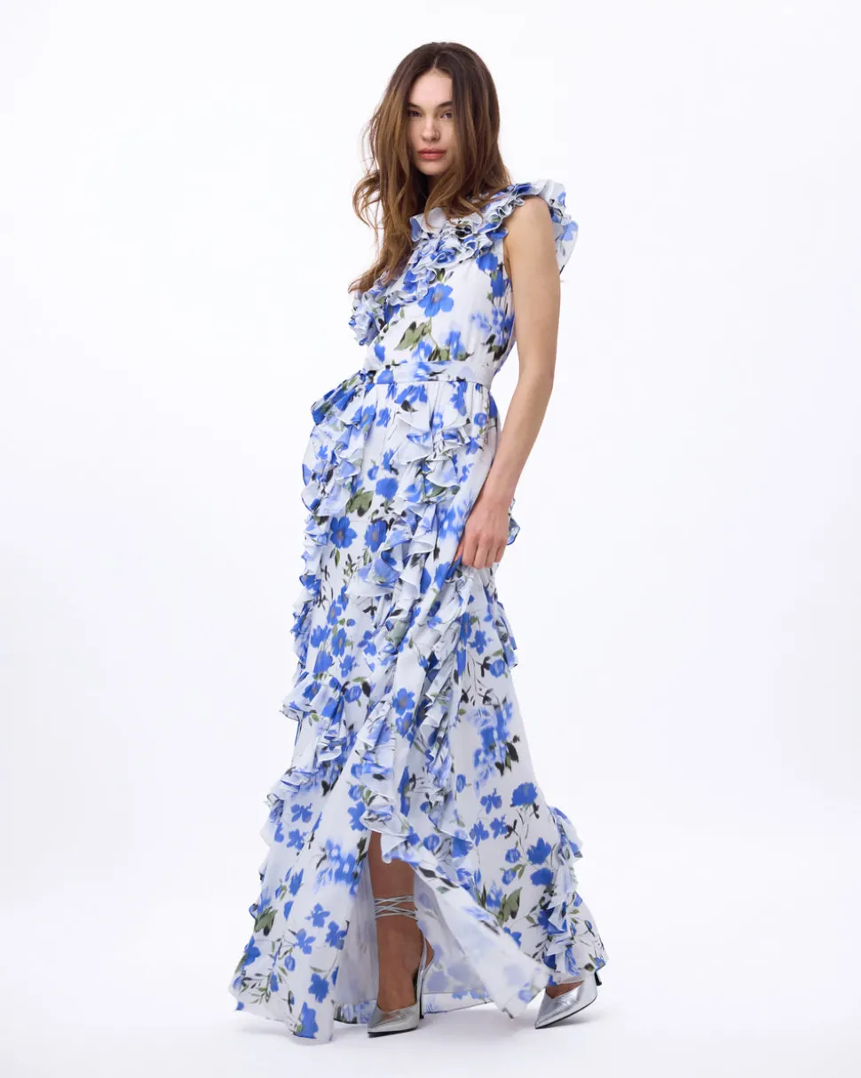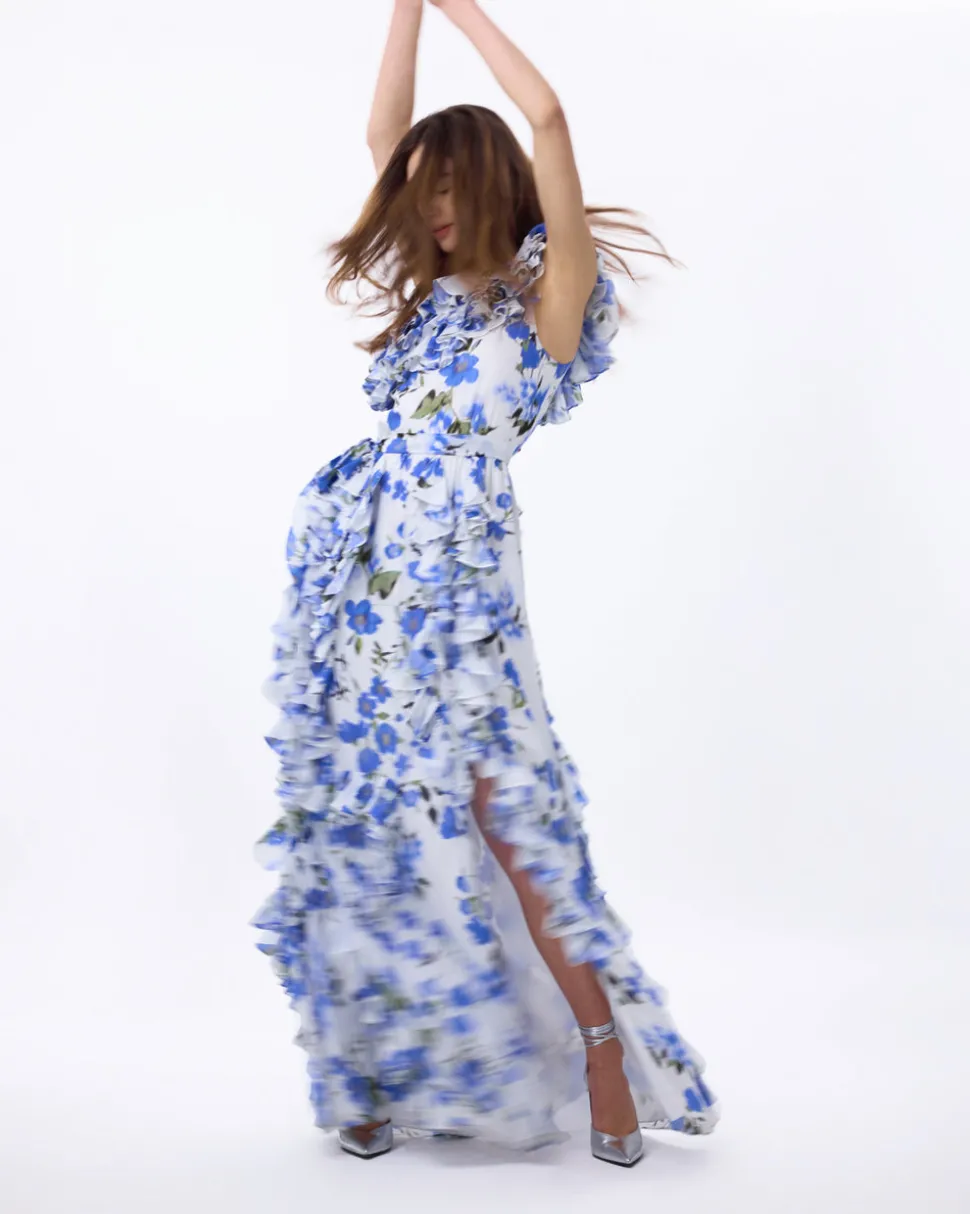 A new line from celebrity favorite Tanya Taylor, Delphine explores the designer’s alter ego, a sophisticated party girl sensibility that mixes vintage red carpet glamour with downtown cool—and just the right amount of edge. Full length and boasting a print on silk, the Angela Gown in Ivory & Bellflower is inspired by a mélange of pearl earrings. We love the cascading ruffles, and surprise thigh-high slit. So mysterious, mesmerizing, and magnetic too.