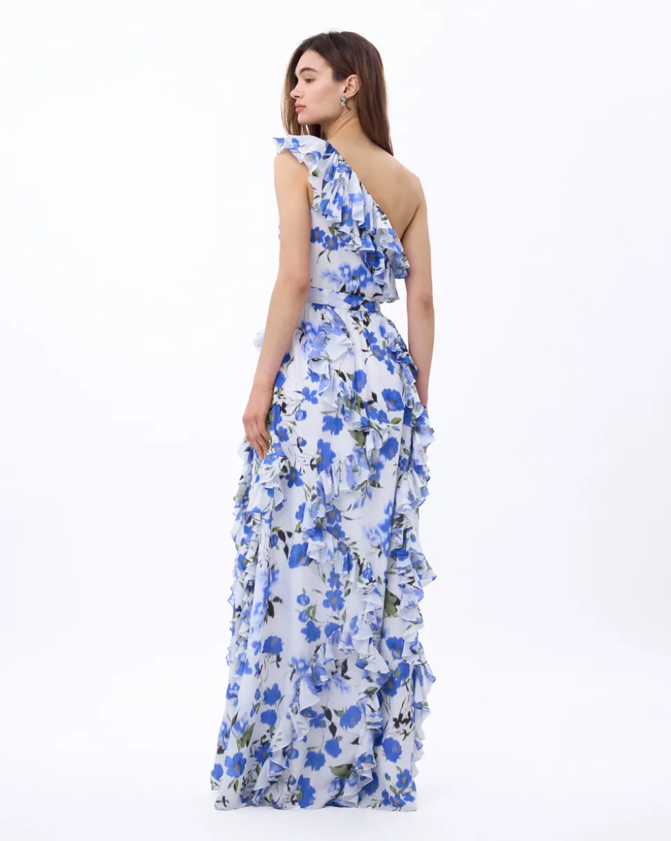54% silk, 46% lyocell. Evening gown. One shoulder. Fitted waistband. Cascading ruffles. Self tie belt. Concealed zipper.