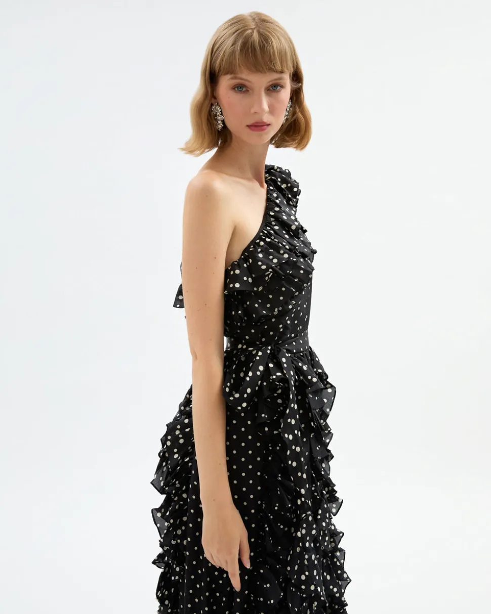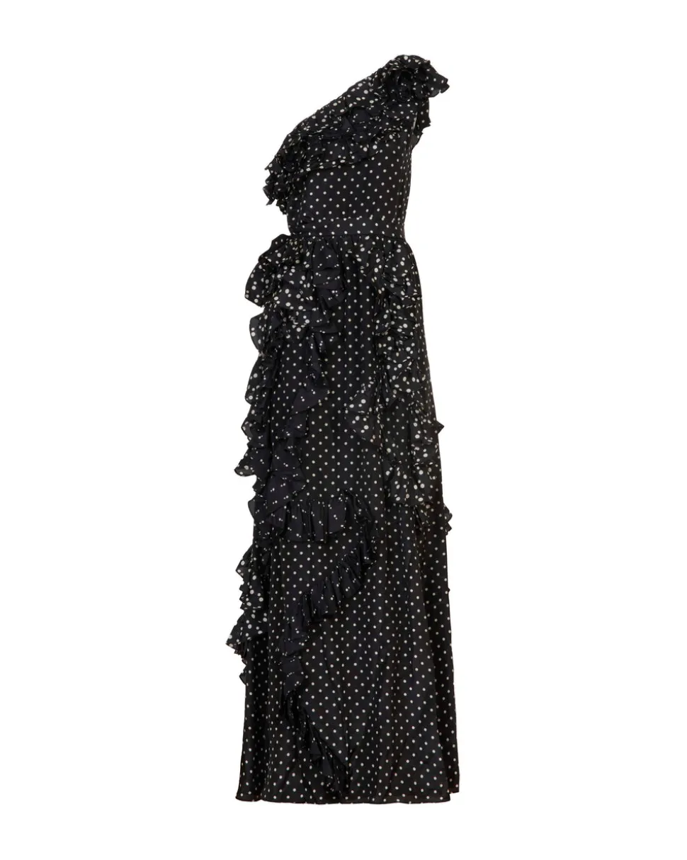 A new line from celebrity favorite Tanya Taylor, Delphine explores the designer’s alter ego, a sophisticated party girl sensibility that mixes vintage red carpet glamour with downtown cool—and just the right amount of edge. Full length and boasting three different types of polka dot prints on silk, the Angela Gown is inspired by a mélange of pearl earrings. We love the cascading ruffles, and surprise thigh-high slit. So mysterious, mesmerizing, and magnetic too.