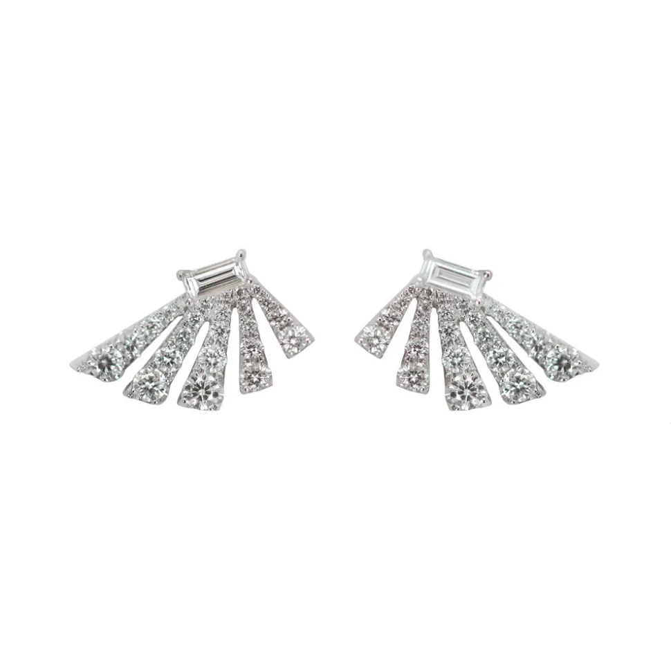 Luxury jewelry for the modern woman, Ri Noor incorporates intriguing into their truly unique designs. No matter what the occasion, these bold and vibrant rings, bracelets, necklaces, and earrings impart a sense of heightened classics, wherein the gems’ organic shapes meet precise settings of silver or gold, and timeless style. Fashionable and elegant, the Angular Fan Diamond Baguette Earrings featuring a baguette diamond atop a fan of diamond solitaires, surrounded by round diamonds, all set in white gold.