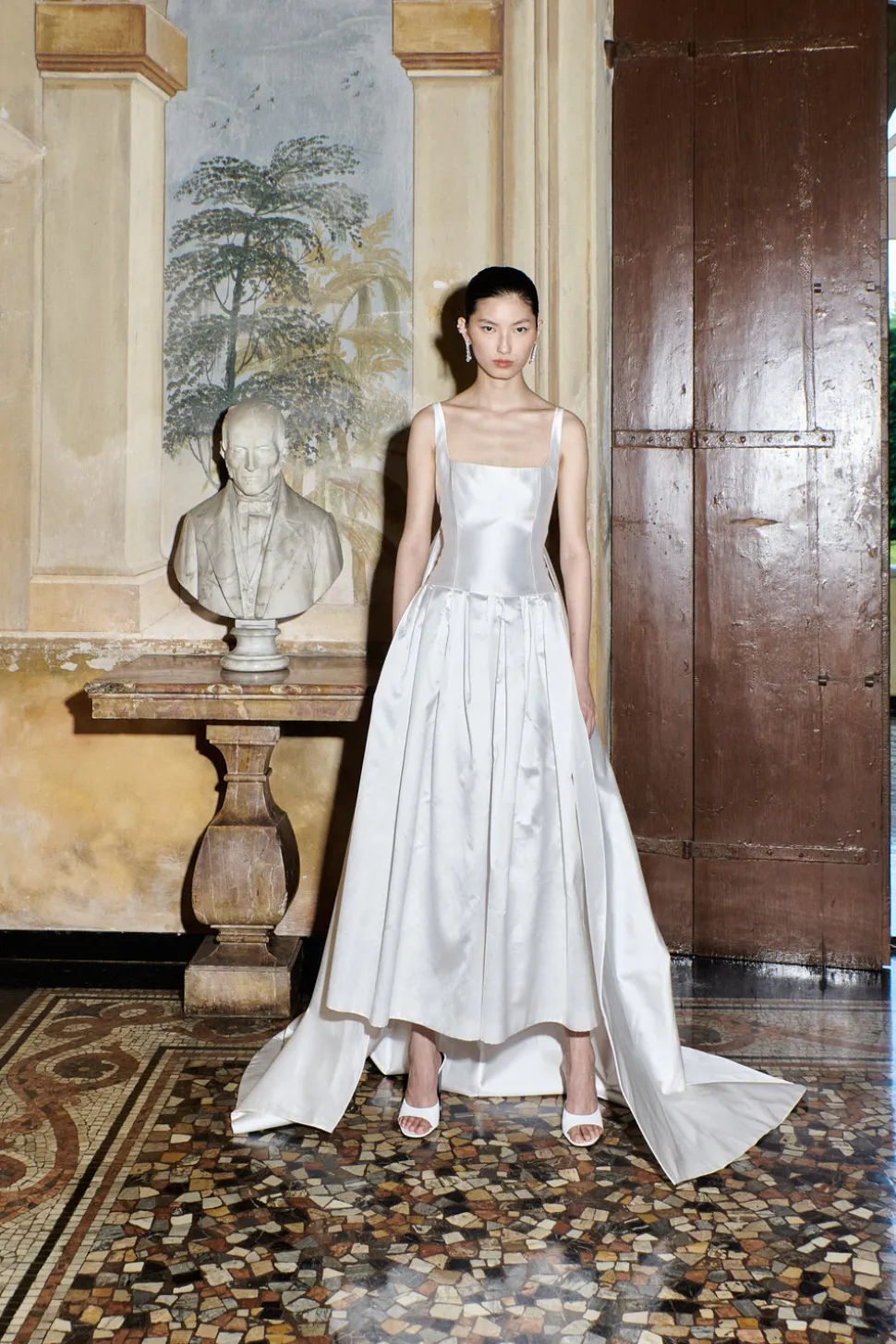 Handmade at its London atelier, The OWN Studio’s signature style combines pared-back, contemporary silhouettes with unexpected vintage details resulting in considered, minimal styles for the modern woman. The label brings a fresh and contemporary approach to wedding and evening wear. Inspired by the refined neckline of the STYLE 111 peekaboo mikado gown, the Ankle Length Drop Waist Gown | STYLE 108 features elegant pleating on the skirt and a flattering drop waist for a timeless yet contemporary silhouette. Crafted in signature silk mikado, it gives unparalleled glamour. Pair with the detachable Watteau train STYLE 135 to add a dramatic, elegant touch.