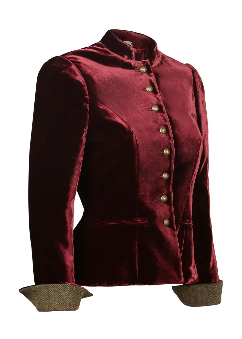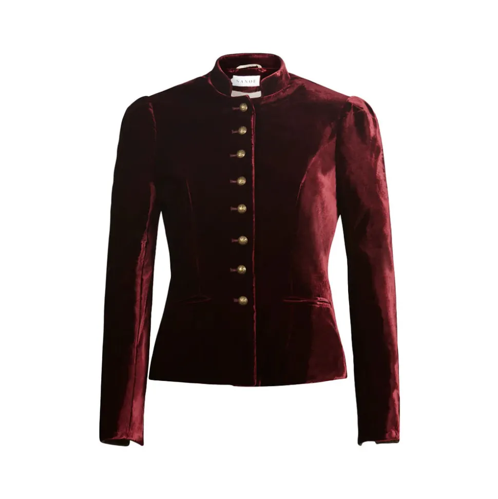 Looking to their Peruvian and Bavarian heritage, lifelong friends Sabrina Burda and Noelle Pallais were inspired to create Sanoë by rummaging through their grandmothers’ closets. With an eye on slow fashion and the other on contemporary style, the NYC-based brand designs their jackets—based on alpine peasant “trachen jacken”—to stand the test of time in small batches using ethically sourced fabrics. Constructed in a flattering silhouette, the Annabelle Cabaret Jacket is buttoned up in divinely shaded ivory.
