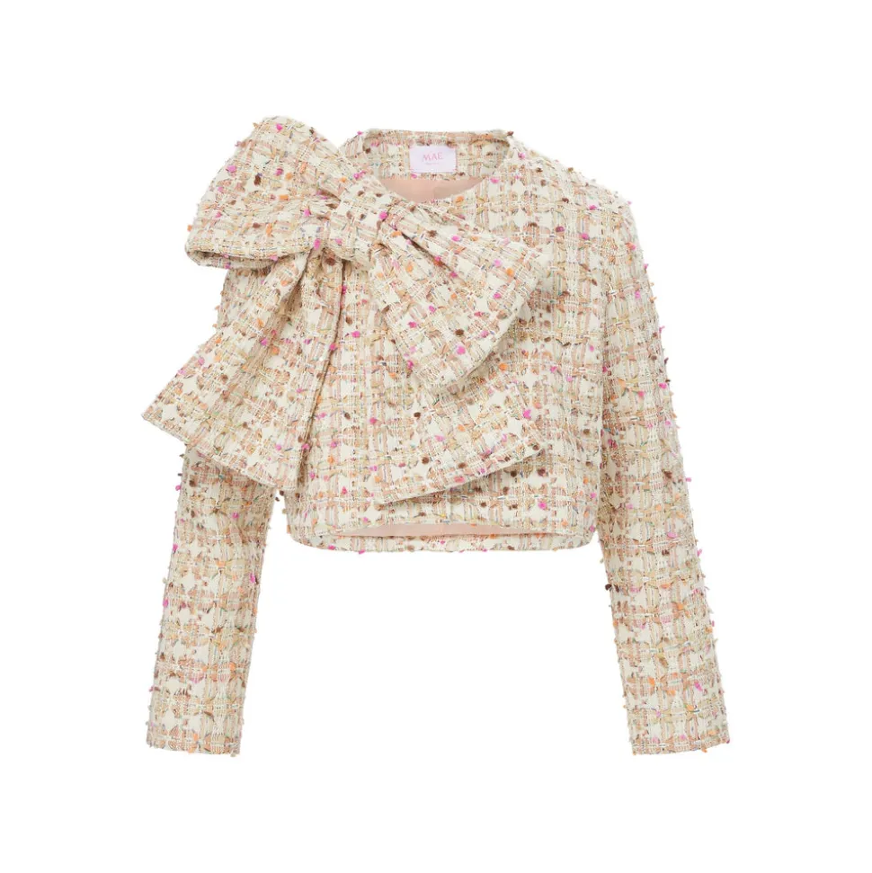 MAE New York seeks to revitalize New York’s historical garment district by creating small-batch and made-to-order collections—modern interpretations of 1960s glamor—highlighting tailoring, luxury materials, and craftsmanship. The Annie Jacket in Pom Pom Tweed boasts delicate pom pom tufts and sequins that adorn her neutral honeycomb weave. Finished with a signature bow. Pair it with the matching Clara Skirt.