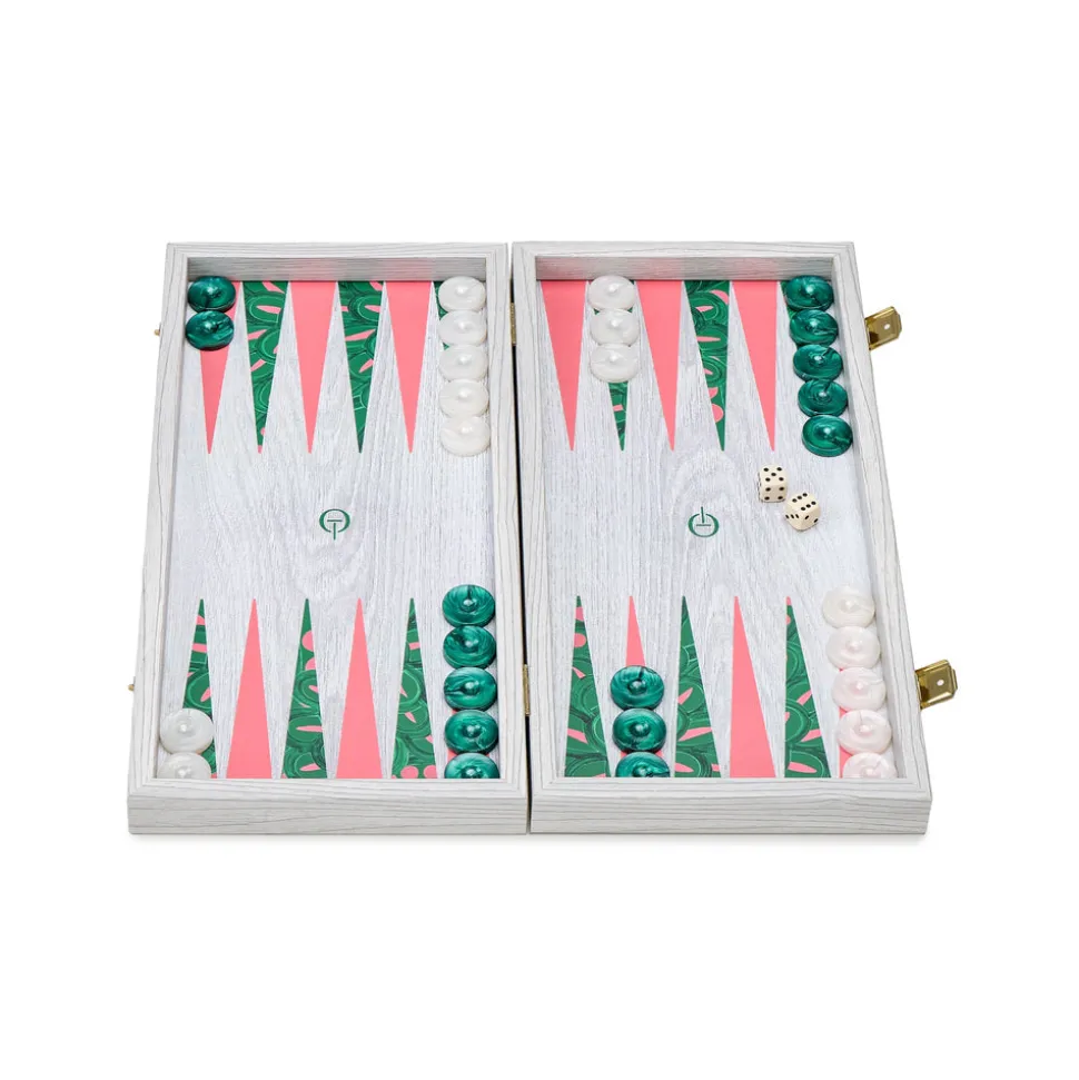Inspired by her Greek heritage and summers spent in Mykonos, Themis Zouganeli launched THEMIS Z. Specializing in geometric patterns and clean lines, every design captures the easy-going glamour of Greece. Ethically sourced and handmade by artisans, THEMIS Z is committed to sustainable practices throughout their crafting process. The Anthos Backgammon in Green & Pink transforms the classic backgammon board with a happy color combination with pearl effect. Comes with its own individual pouch decorated with the backgammon’s pattern.