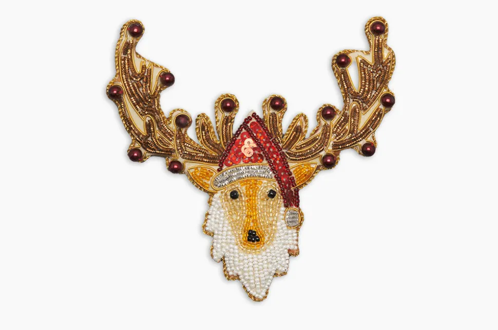 Founded in 2012, Henry Handwork brings joy to the everyday with handmade textiles for the home. Placing tradition and quality at the forefront, the brand resurrects the fading craft of hand-embroidery and needlework, embracing the heritage of finely-wrought European linens. The Antlers Ornament is embellished with beads, metallic thread and hand-stitched on velveteen fabric. Wearing a little Santa hat, this piece is a cute, traditionally festive reindeer to add to any tree.