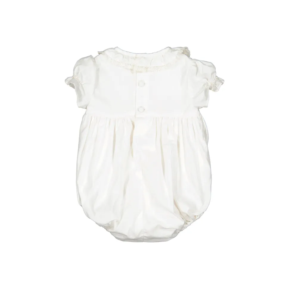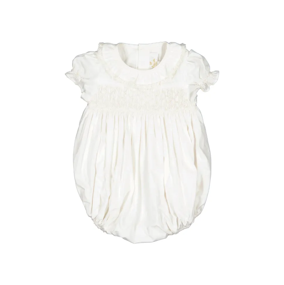 Double layer 100% cotton. Classic white handmade smocked Bubble with short balloons sleeves. White embroidery on the chest and waiving frills collar with white lace.
