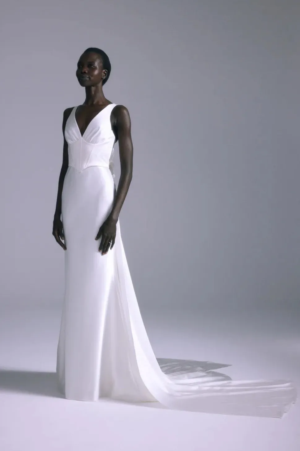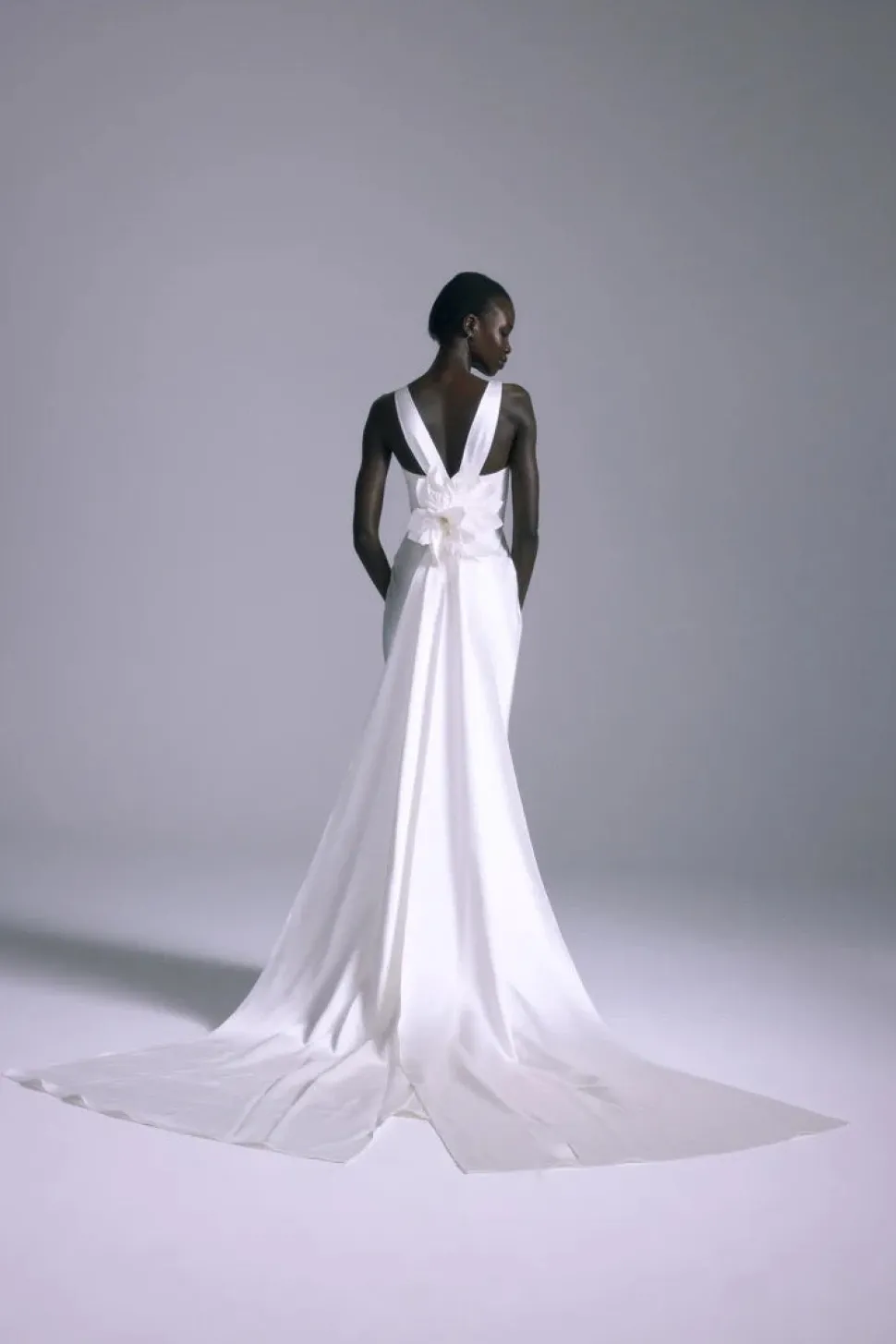 Over three decades ago, Ethiopian-born Amsale Aberra began crafting modern, personalized wedding dresses, beginning with her own. Today, her distinct bridal gowns—handmade with couture techniques in AMSALE’s New York City atelier—share their tasteful femininity, unstated glamour and attention to detail with sophisticated women the world over. The Aoki Gown is an Italian double liquid satin corset bias slip gown with a voluminous flower and detachable streamer.
