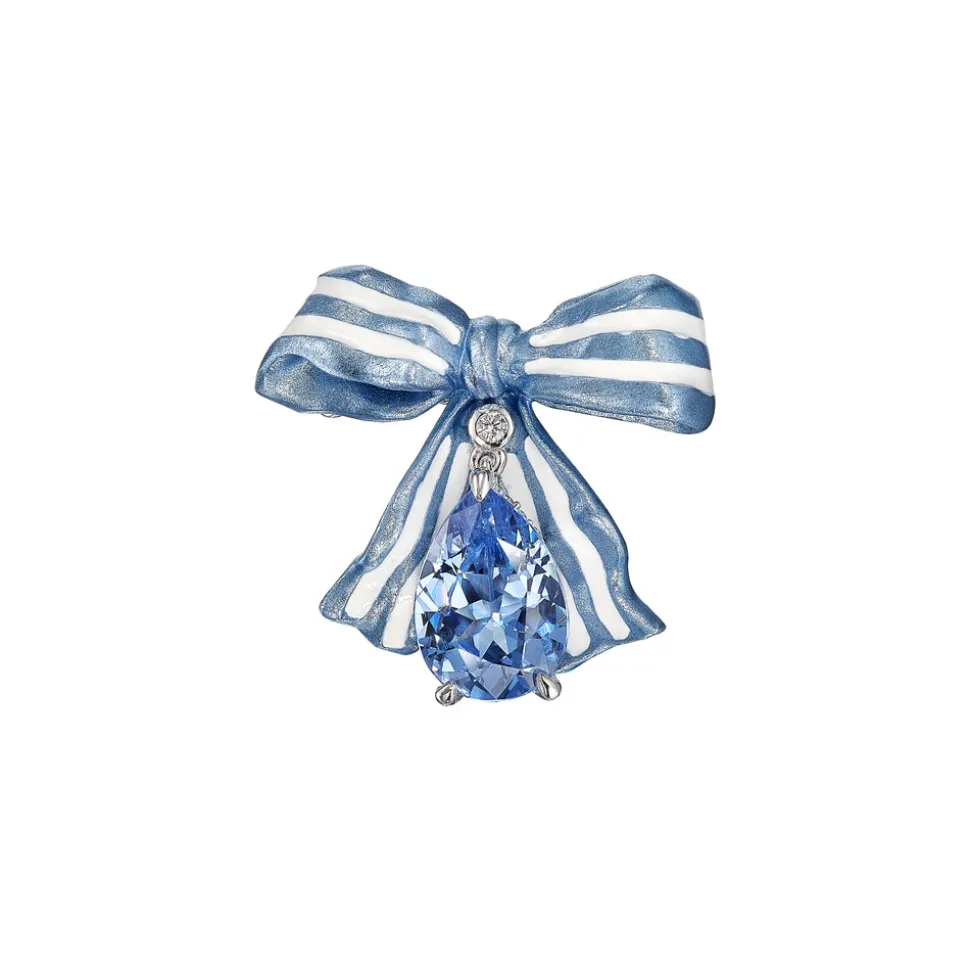 Recycled aluminum, enamel, 18K white gold, rhodium vermeil. Laboratory-grown blue spinels (4.4 carats). Laboratory-grown simulated white diamonds. Handcrafted in the United Kingdom.