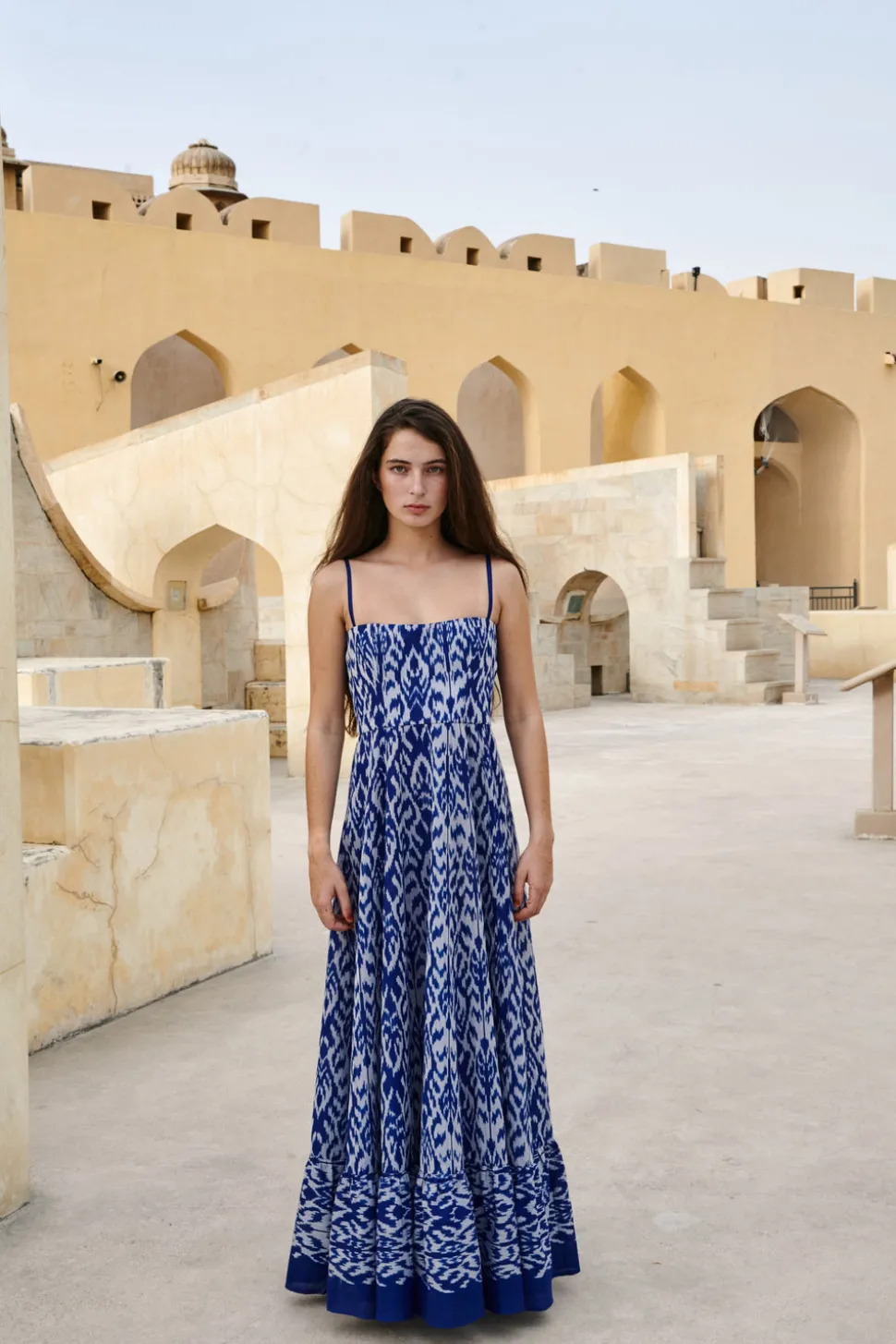 De Castro showcases a seamless and unique blend of traditional Indian craftsmanship, contemporary design, and the founder’s Colombian heritage. Every piece is handmade by artisans, using time-honored techniques and the finest cotton and silk fibers, resulting in exceptional quality, sustainability, and style. The Aquarius Dress features a flattering fitted waist and a beautifully crafted corset top adorned with a blue and light gray ikat pattern. An elegant panelled skirt, delicate shoulder straps, and an easy-to-use back zipper closure all add a touch of luxury to your wardrobe.