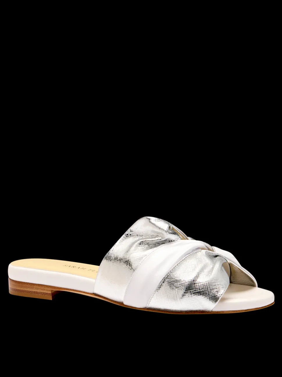 Sarah Flint sources the most exceptional materials from triple-dyed Italian suedes to jacquards woven in 300-year-old British mills. Once crafted in Italy, shoes go through rounds of prototyping and fit-testing to ensure comfort and durability. The Arabesque Slide in White & Silver Textured Nappa is a bestselling style that combines effortless elegance with a buttery soft feel. Designed for all-day comfort, this slide effortlessly transitions from casual to chic, making it the ideal addition to your summer wardrobe.