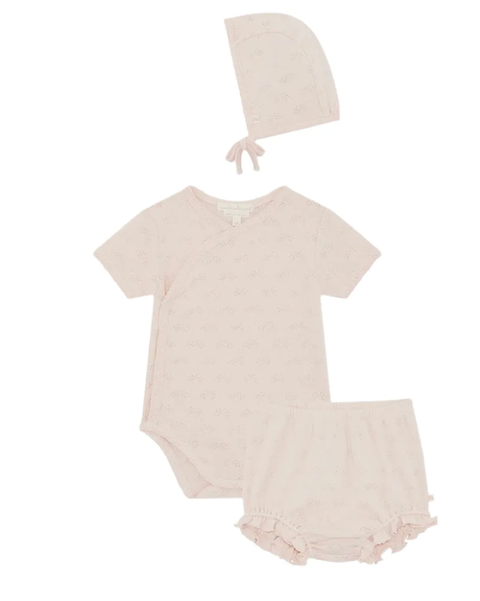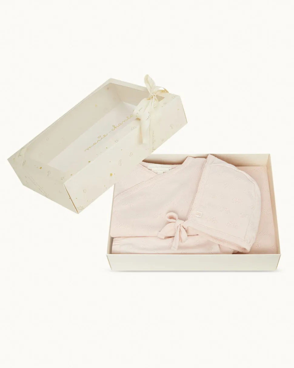 Princess Marie-Chantal of Greece’s eponymous label is known internationally for its unmatched style and the quality of materials—like their organic, hand-picked Pima cotton—which lies at the heart of their baby essentials and contemporary children’s clothing. The Araminta Angel Wing Pointelle Gift Set made from 100% premium Pointelle Cotton, designed for your little one’s comfort and style. Ideal for those gentle Spring and Summer days, this set includes a Pointelle onesie, playful bloomers, tie bonnet and cozy blanket–all matching in soft pink.