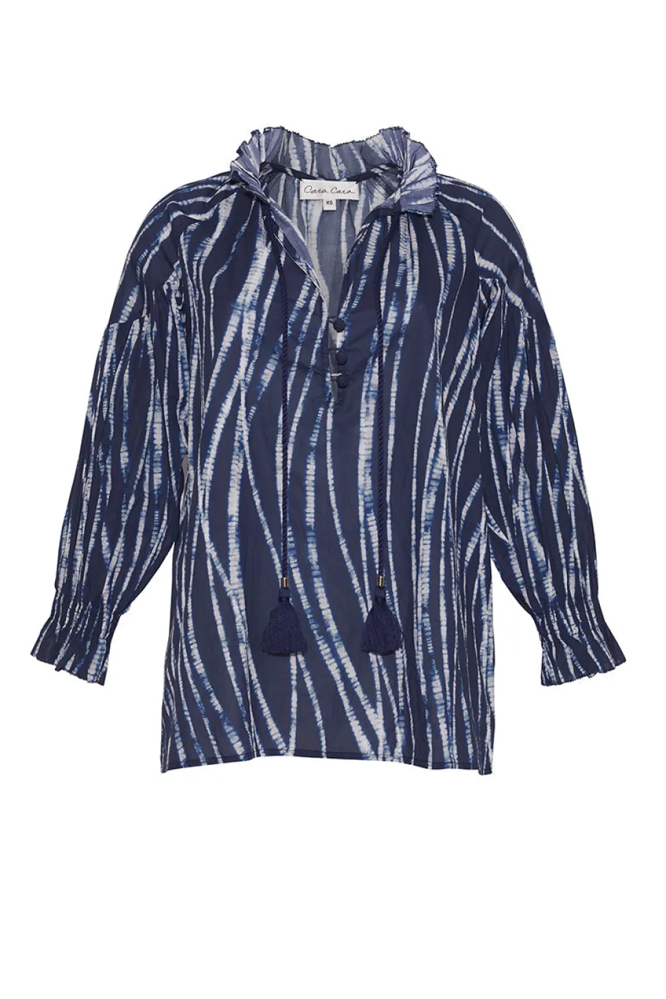 100% cotton voile. Loose easy oversized fit. Balloon sleeves. Novelty ties with fringe and gold cord ends. Novelty buttons. Smocked cuffs. Allover print.