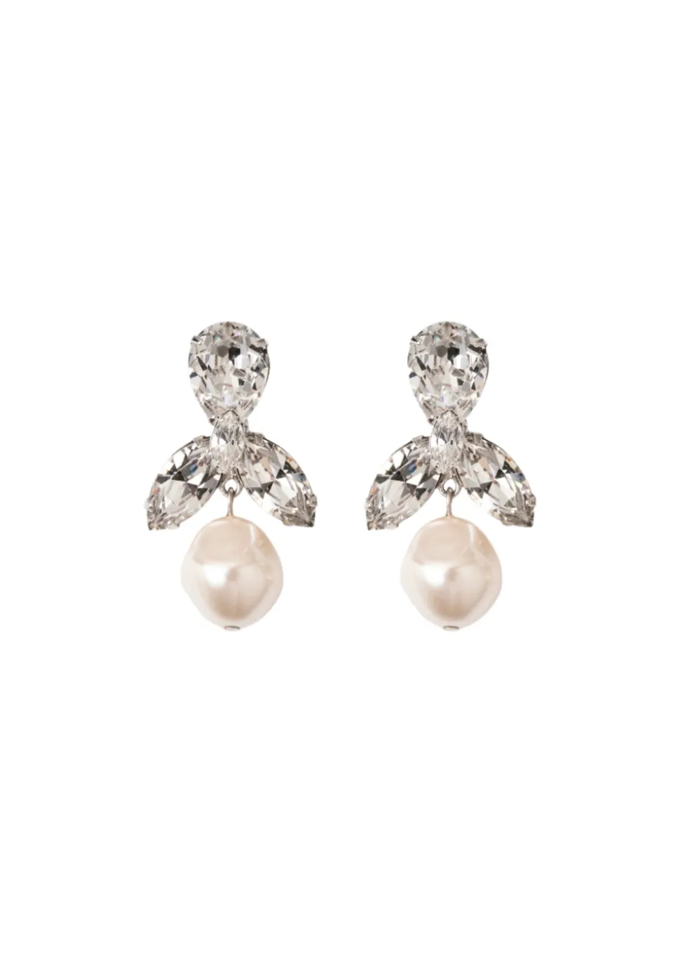 Rhodium plated brass. Crystals. Poly baroque pearls. Surgical-steel posts. Nickel-free and safe for sensitive skin. Handmade in New York.
