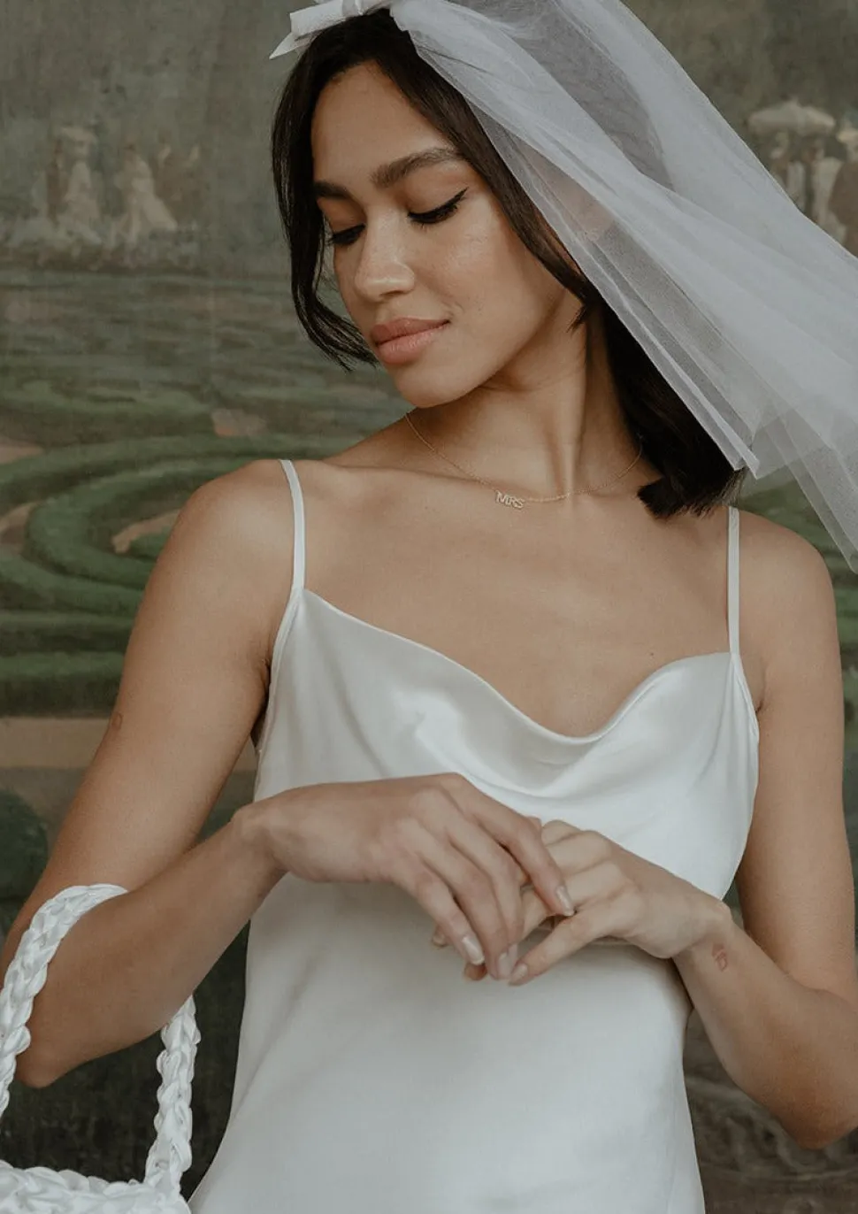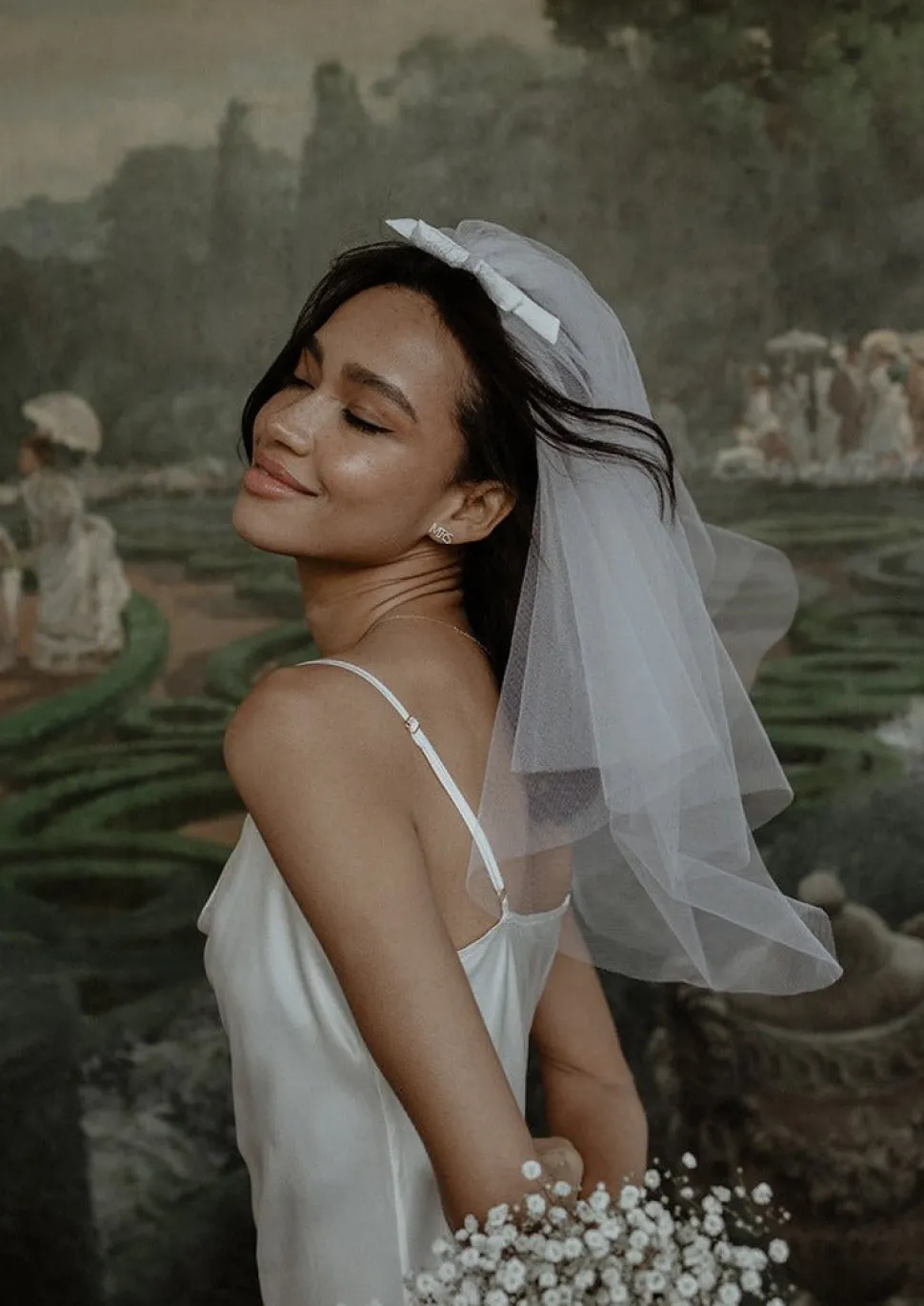 Built on the bonds of sisterhood, Gigi & Olive offers thoughtfully curated collections for brides-to-be from Georgie Le Roux and her sister Olivia. Offering everything from personalized hats to table linens, with a gorgeous embroidery service, the brand’s veils, hair bows, scrunchies, handkerchiefs and garters are at original, fashionable, and aspirational. Short in length, with a full-body tulle and a small thin bow across the top of the hair comb, calling to the 1980s, the Ariana Veil is a chic addition to your wedding weekend look.