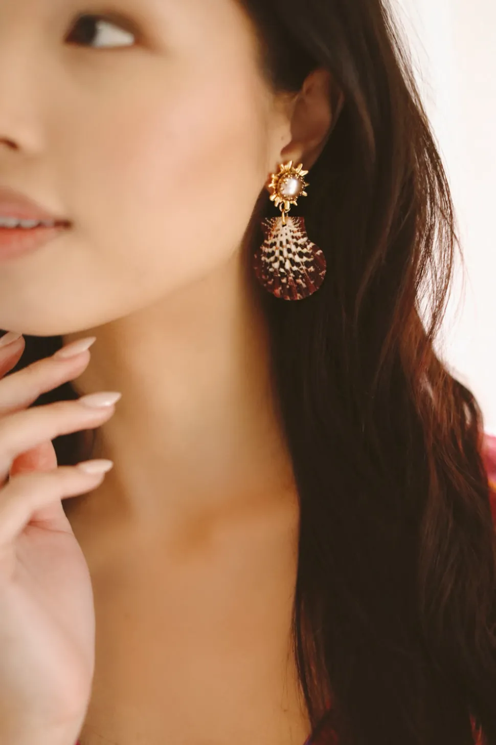 Hand-made. Pallium Pectin shells. 24K antique gold-plated starburst toppers. Glass pearls. Stainless steel hypoallergenic posts. Featherweight. Please note that no two natural shells are exactly the same; they range slightly in color, size and detailing due to being natural materials. Each shell has its own unique markings and there will be slight variations due to the individuality of each piece.