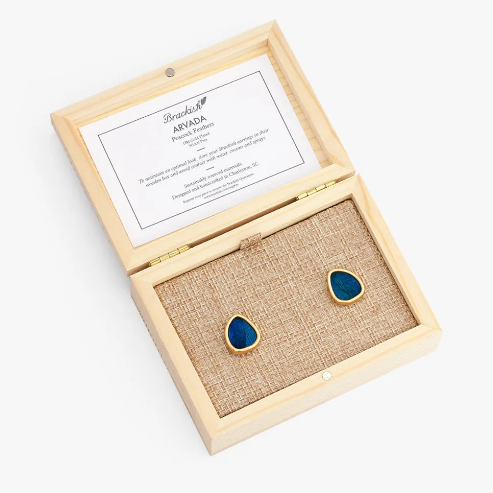 Brackish began with one feather bow tie designed by Ben Ross and gifted to his groomsman, Jeff Plotner. Since its inception, the brand has blossomed into a full line of men’s and women’s accessories designed and handcrafted in Charleston, South Carolina with each piece focused on honoring the beauty found in nature. Boldly blue, and delicately crafted with peacock feathers, the Arvada Stud Earring animates iridescent hues in the changing light.