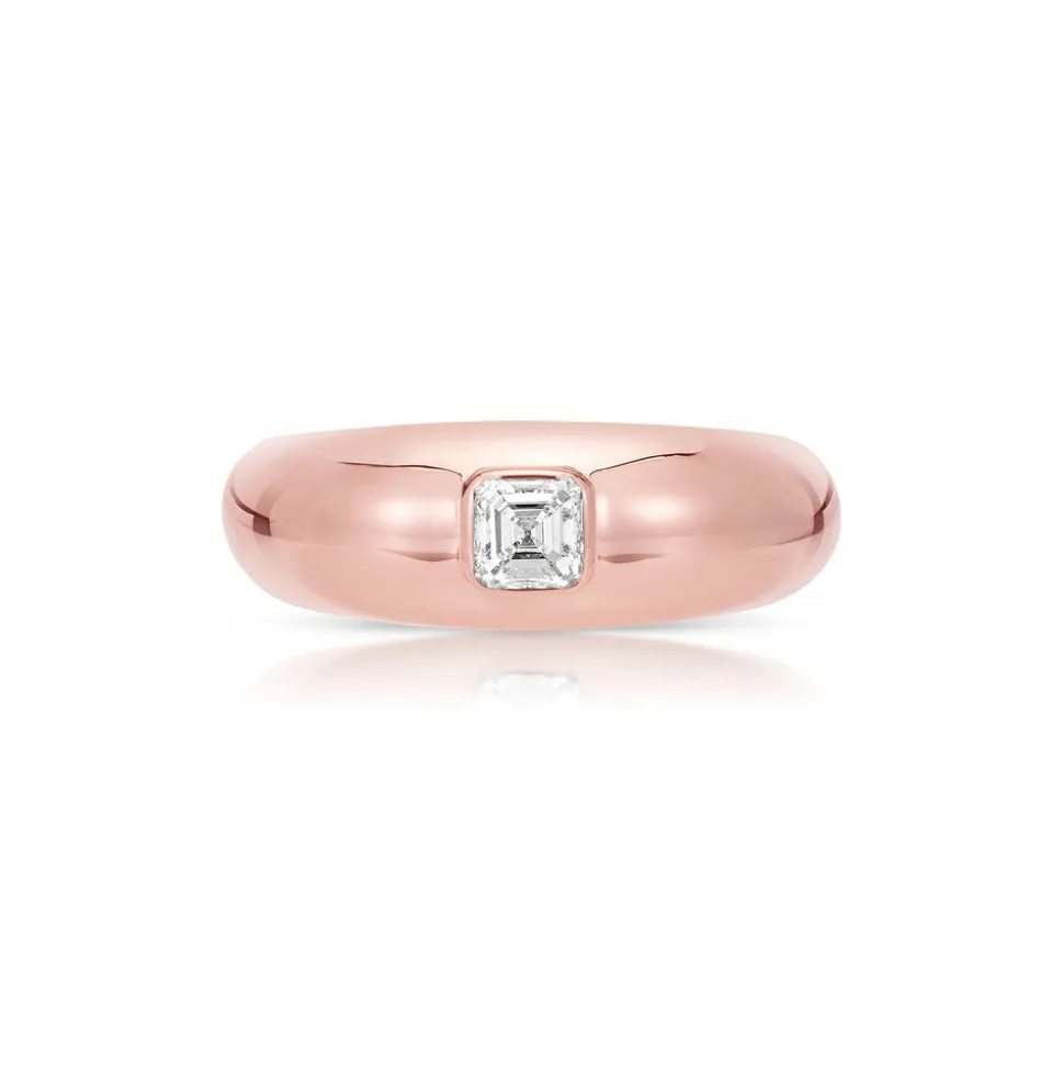 Born into a family of fine jewelers, sisters Oren and Yarden Katz use recycled 14 karat gold and ethically sourced diamonds to craft their contemporary pieces in their Downtown Los Angeles studio. Worn by the likes of Taylor Swift and Jessica Alba, the jewelers are inspired by antique and custom pieces found in their mother’s jewelry box, and each new collection brings a uniquely modern interpretation of heirloom design and technique. Asscher Dome Band boasts the brand’s classic style dome band with an Asscher cut diamond at the center. You just found your “wow” factor.